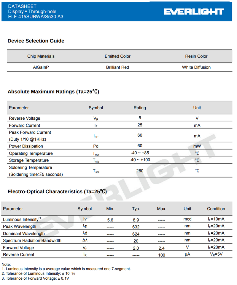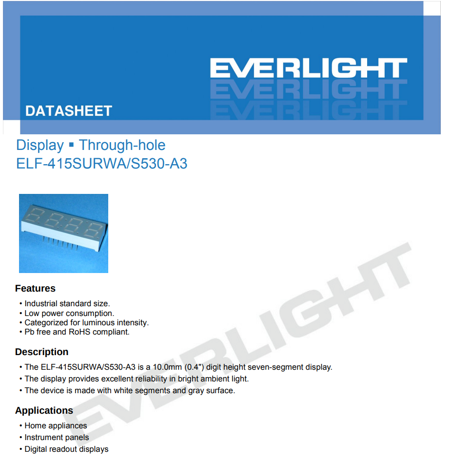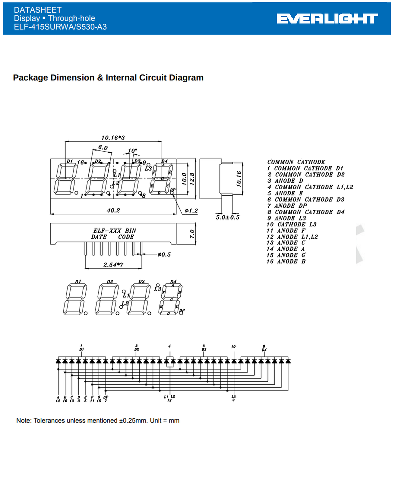 1X ELF-415SURWA/S530-A3 EVERLIGHT 7 Segment 4-Digit LED Display 0.4" Red 16-DIP Common Cathode