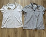 * EP Pro Women's Short Sleeve Polo Shirts - great for golf, tennis, pickleball and more * Lot of 2 * Size: M * Color: White with gold metallic print, white with navy blue and kelly green print * Material: 96% Nylon, 4% Spandex / 92% Cotton, 8% Spandex * Machine Washable * Items are in excellent pre-owned condition - clean and free from rips, stains or tears. Please see photos for complimentary measurements. Item will ship USPS Ground Advantage unless buyer would prefer to expedite for an additional cost. Please feel free to reach out with any questions!