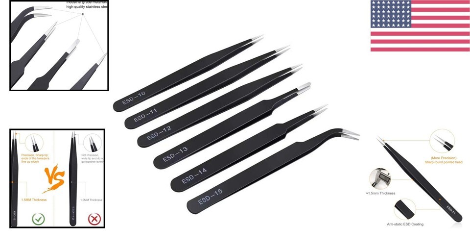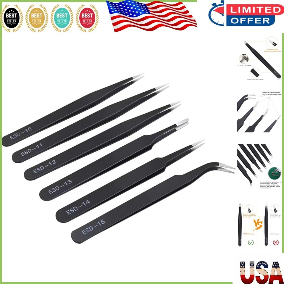 ESD Tweezers Set of 6 - Precision Tools for Electronics, Crafts Jewelry Design