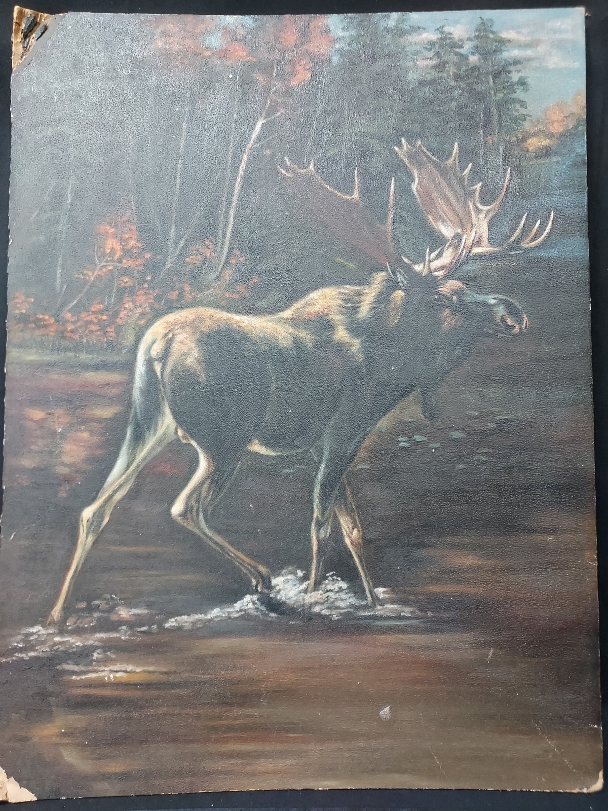 Early 1900s Folk Art Oil Painting Moose Wildlife Scene Found In Northern Vermont