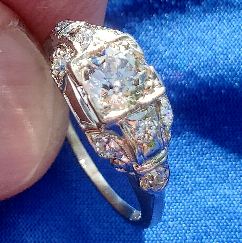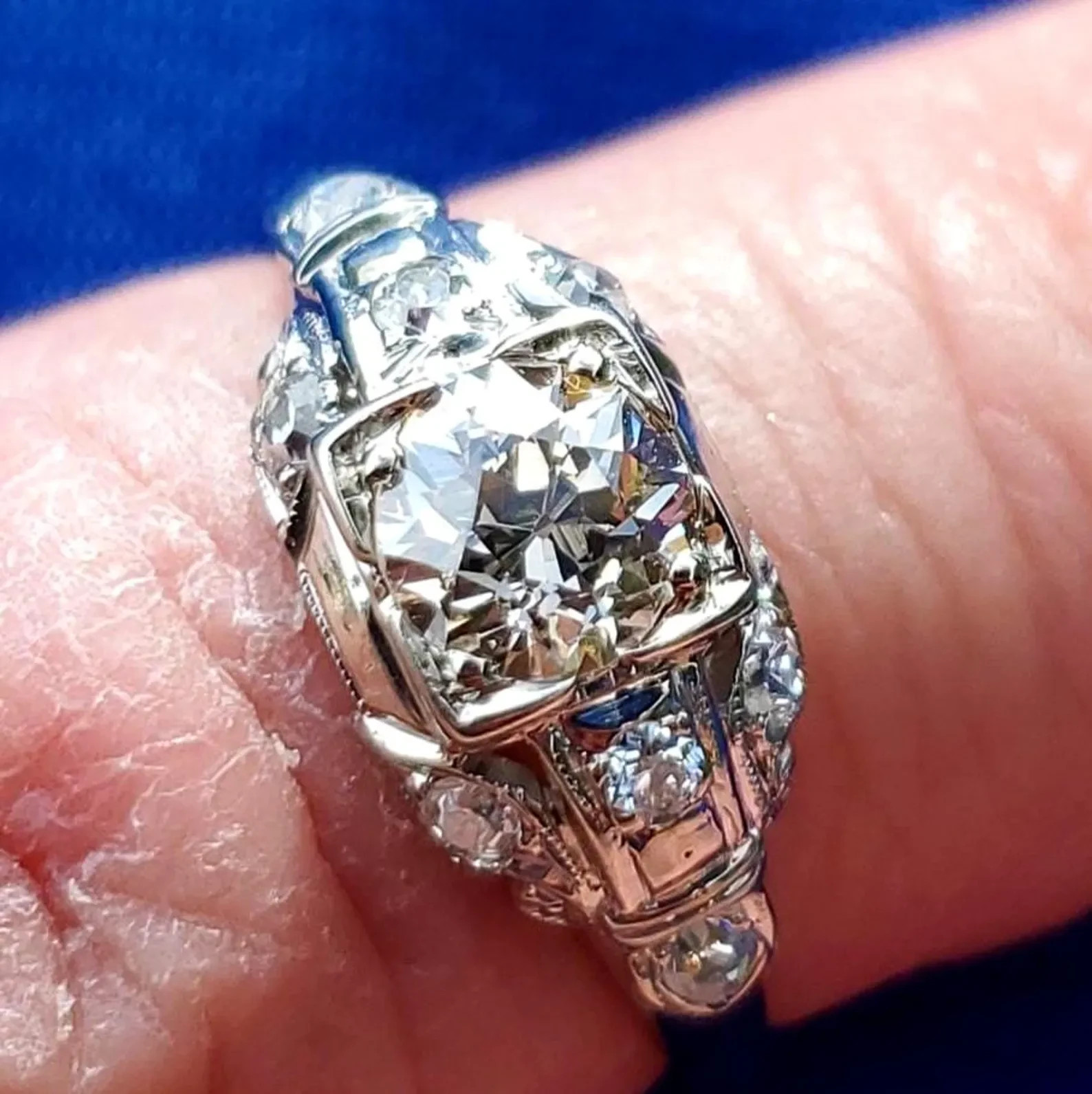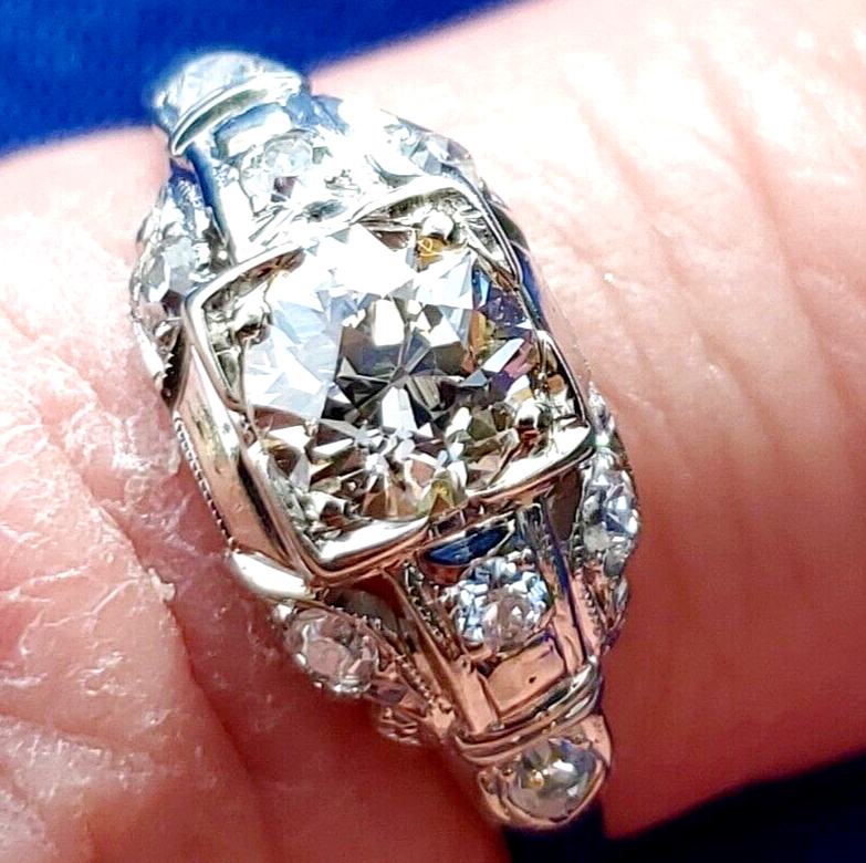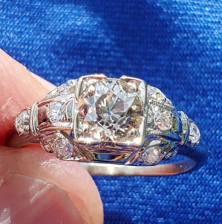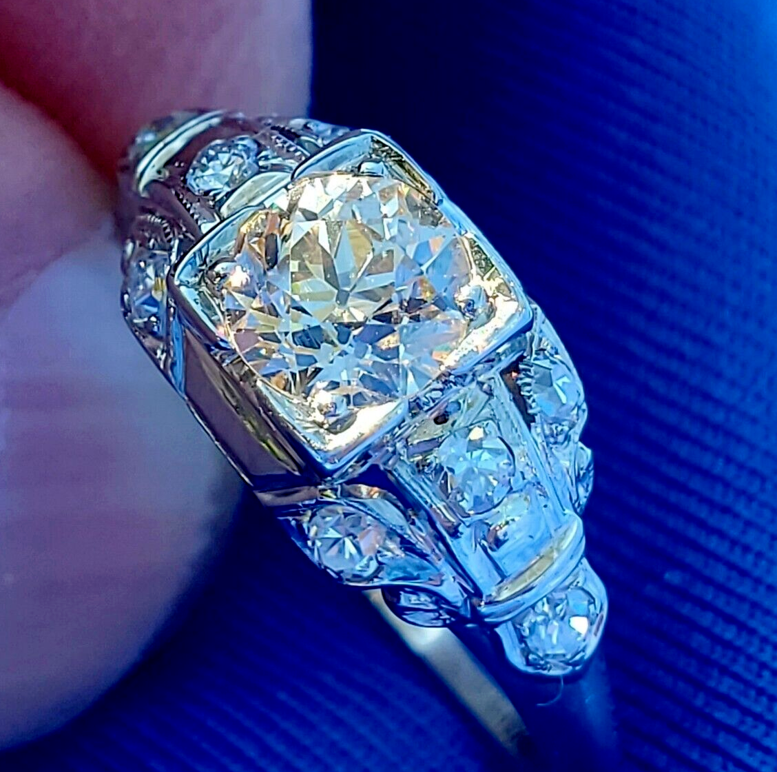 Earth mine Diamond European cut Deco Engagement Ring Solid 18K Gold Solitaire