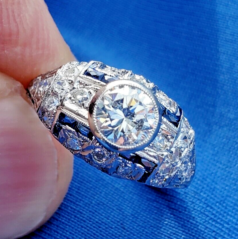 NATURAL EARTH-MINED DIAMOND SAPPHIRE DECO PLATINUM ENGAGEMENT STATEMENT RING.