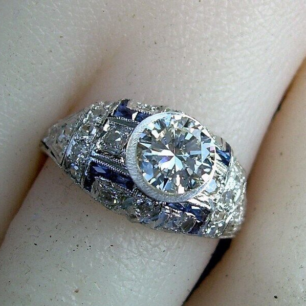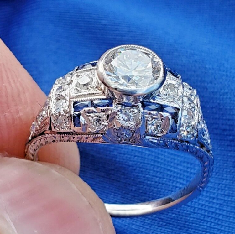 Art deco diamond sapphires Gatsby era engagement ring in solid platinum.