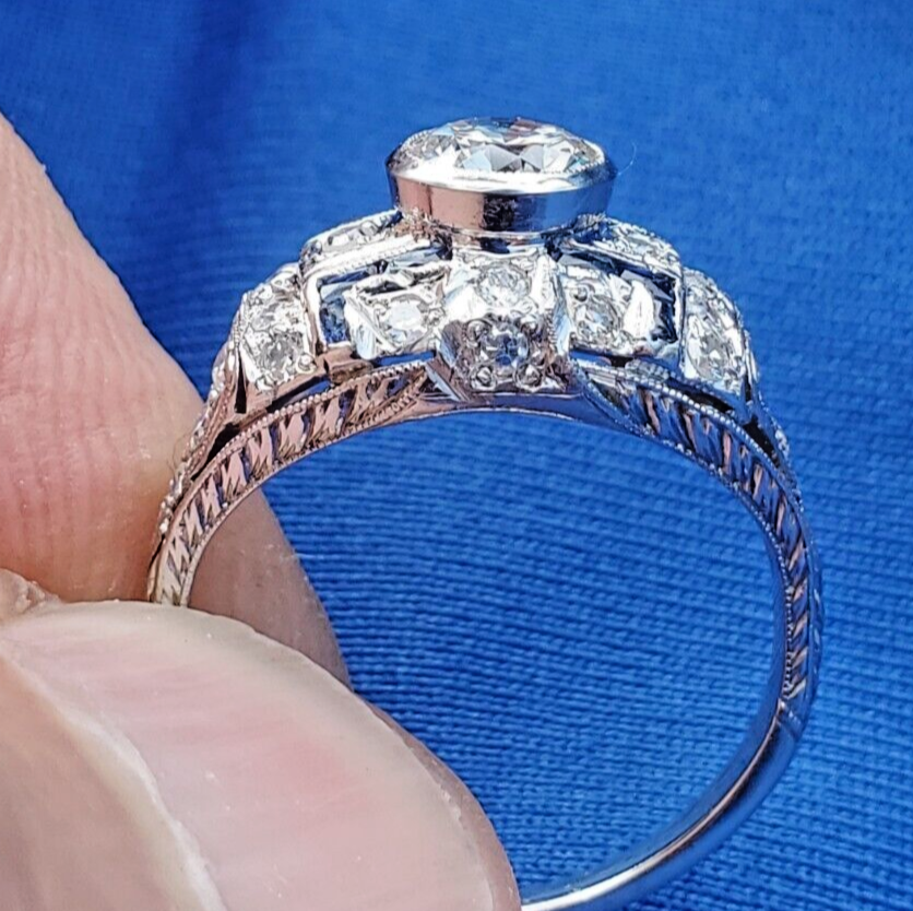 Magnificent flapper era platinum ring features beautiful pierced filigree details.