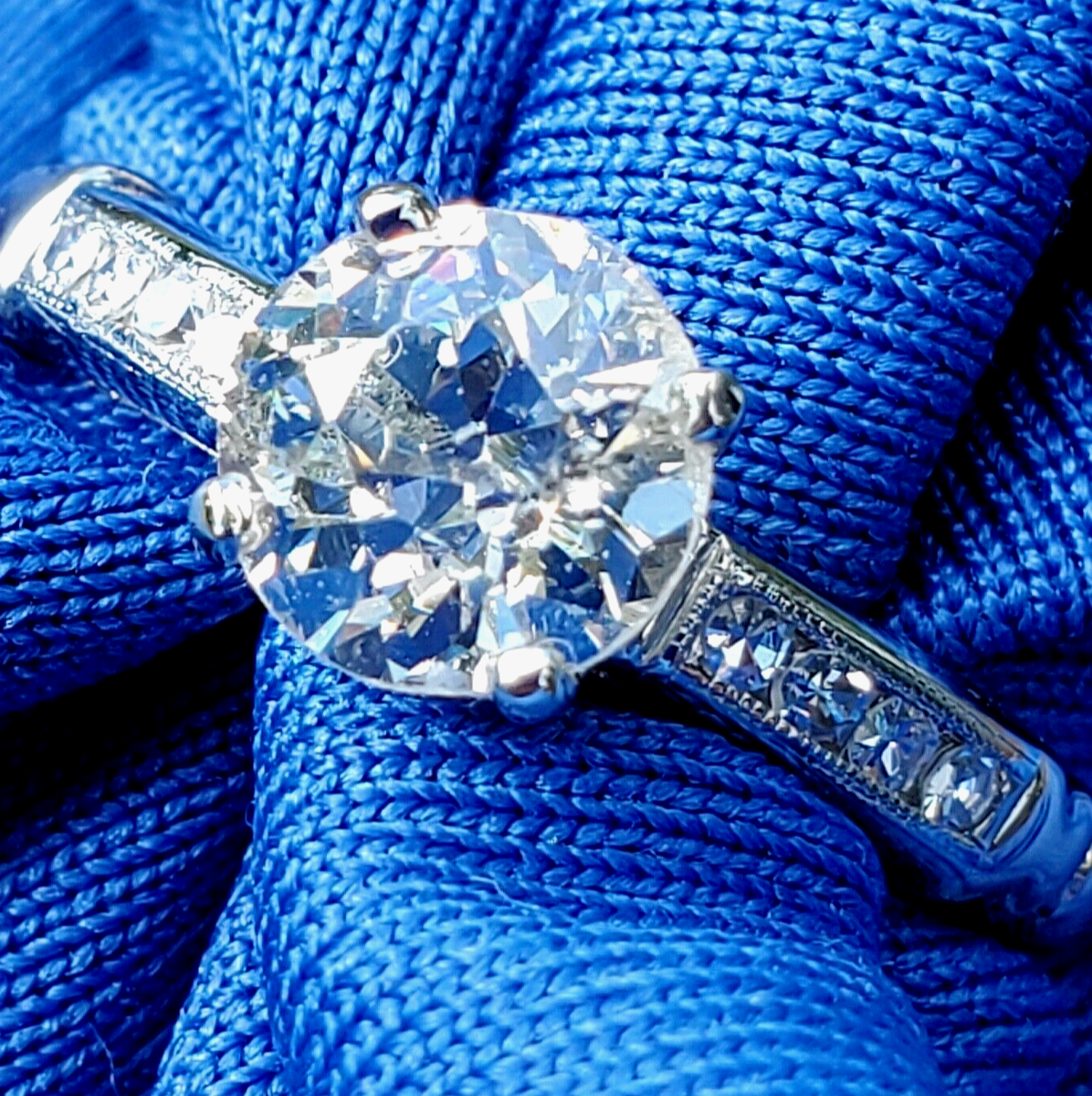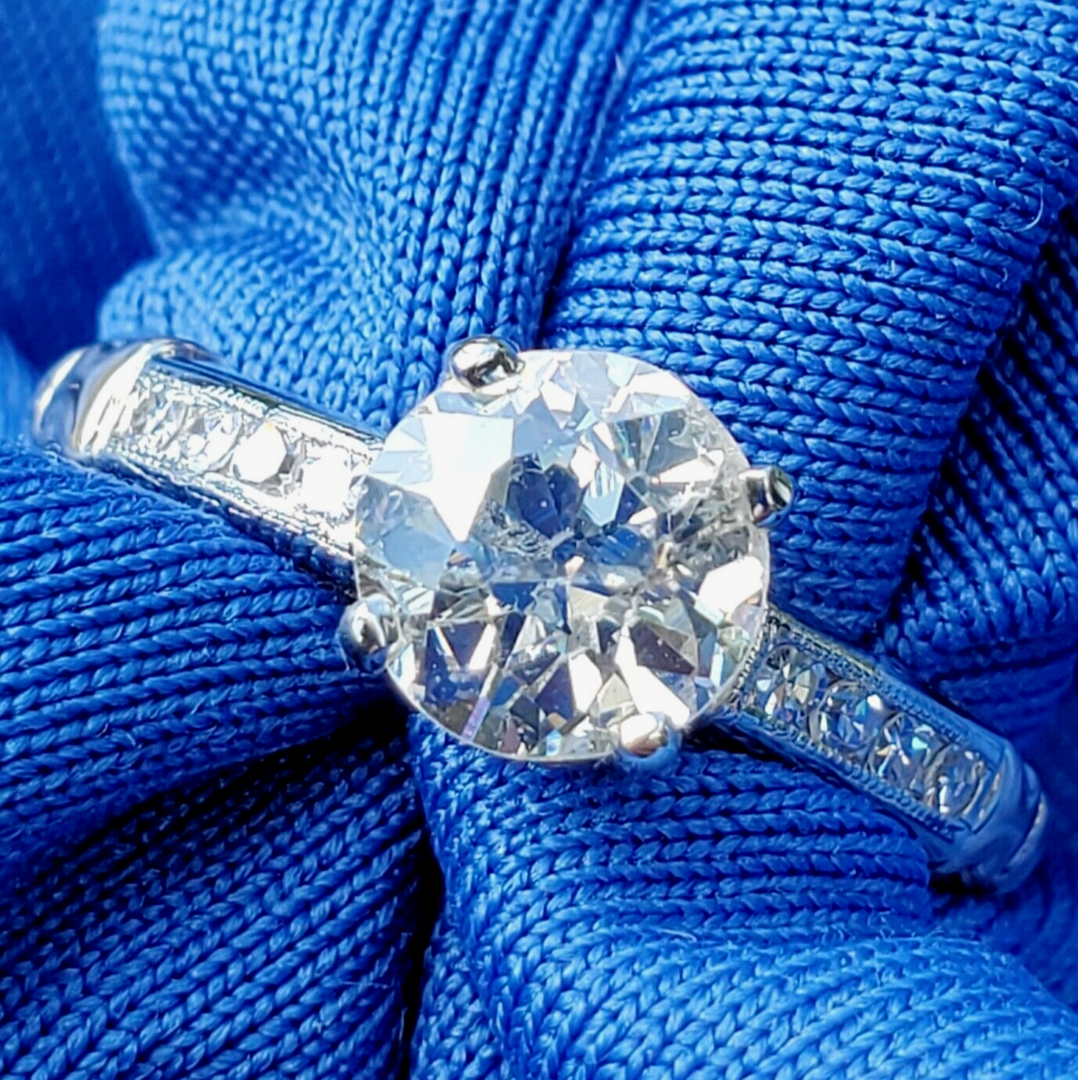 Deco solitaire featuring European cut diamond set in platinum bridal ring.