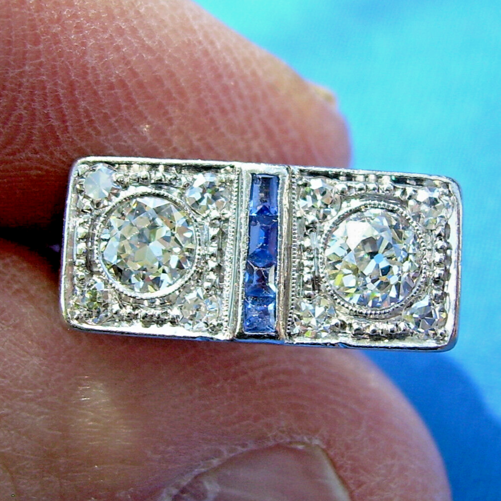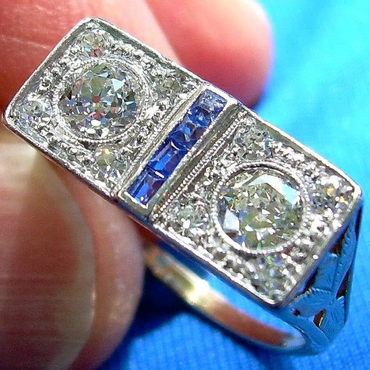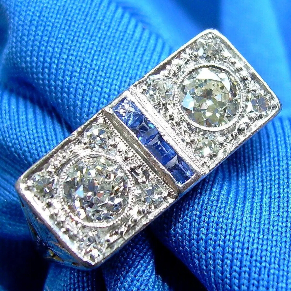 - Earth mined Diamond Sapphire Deco Ring Vintage Platinum 14k Gatsby era Statement