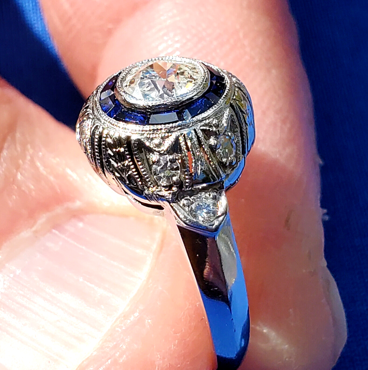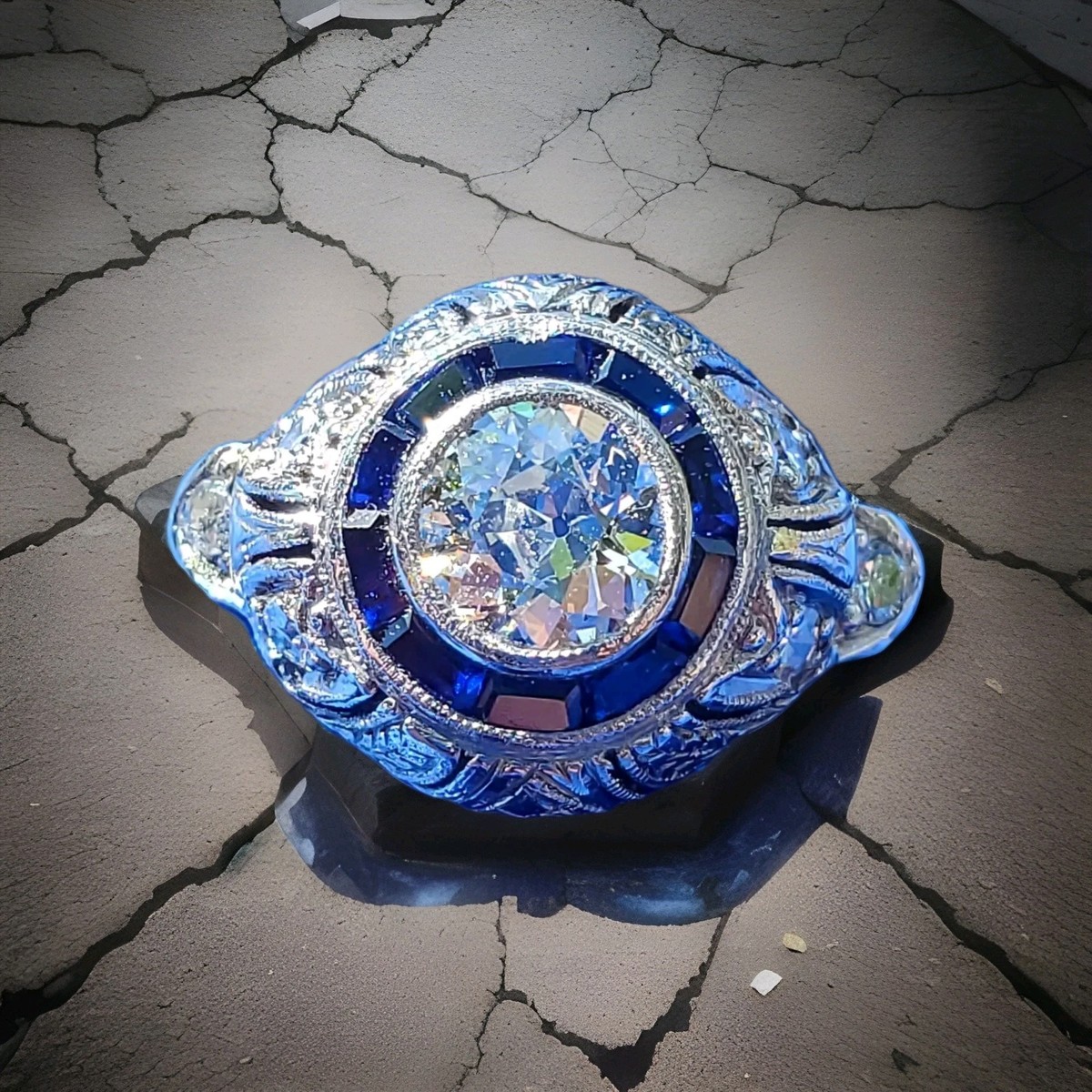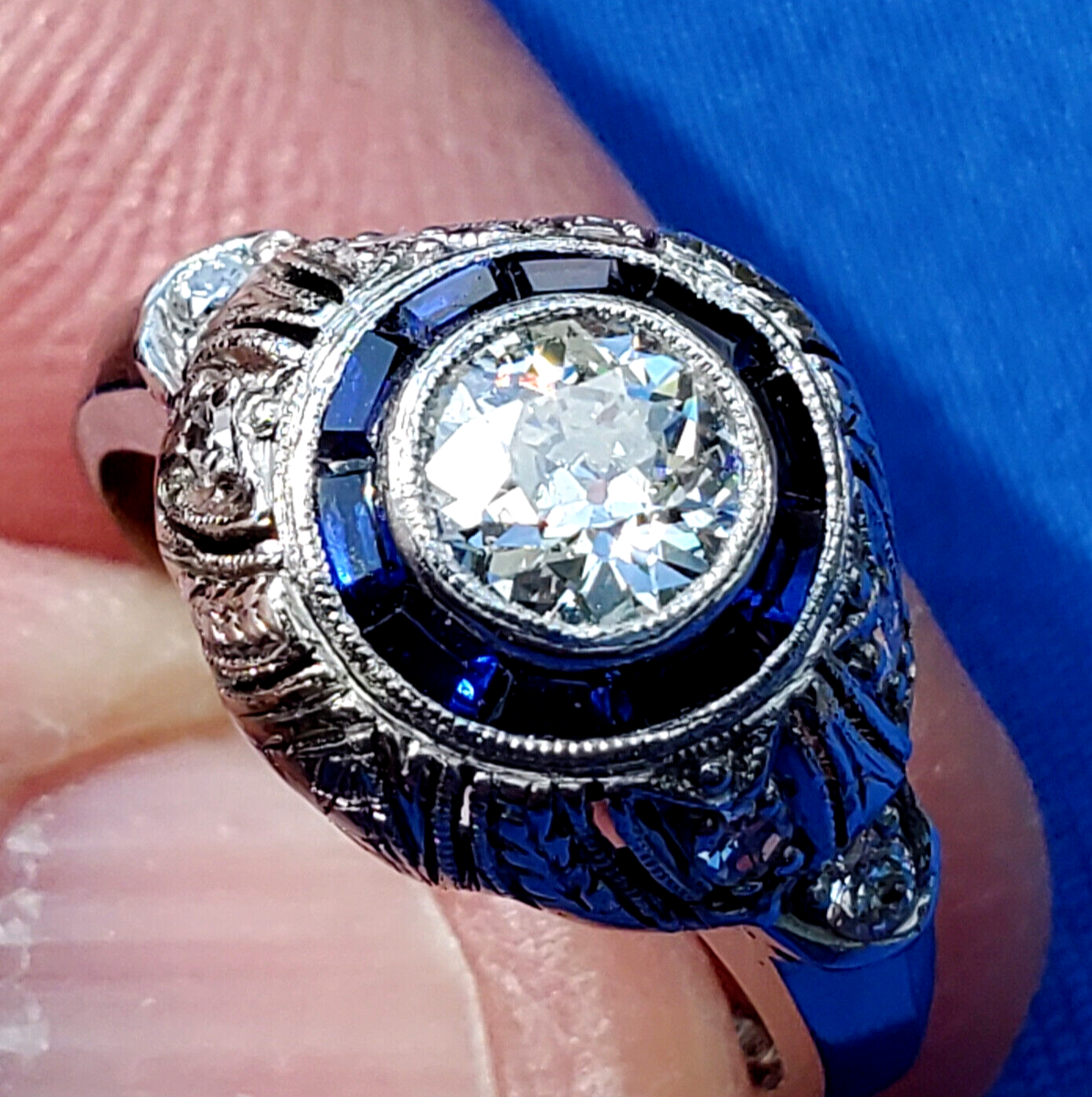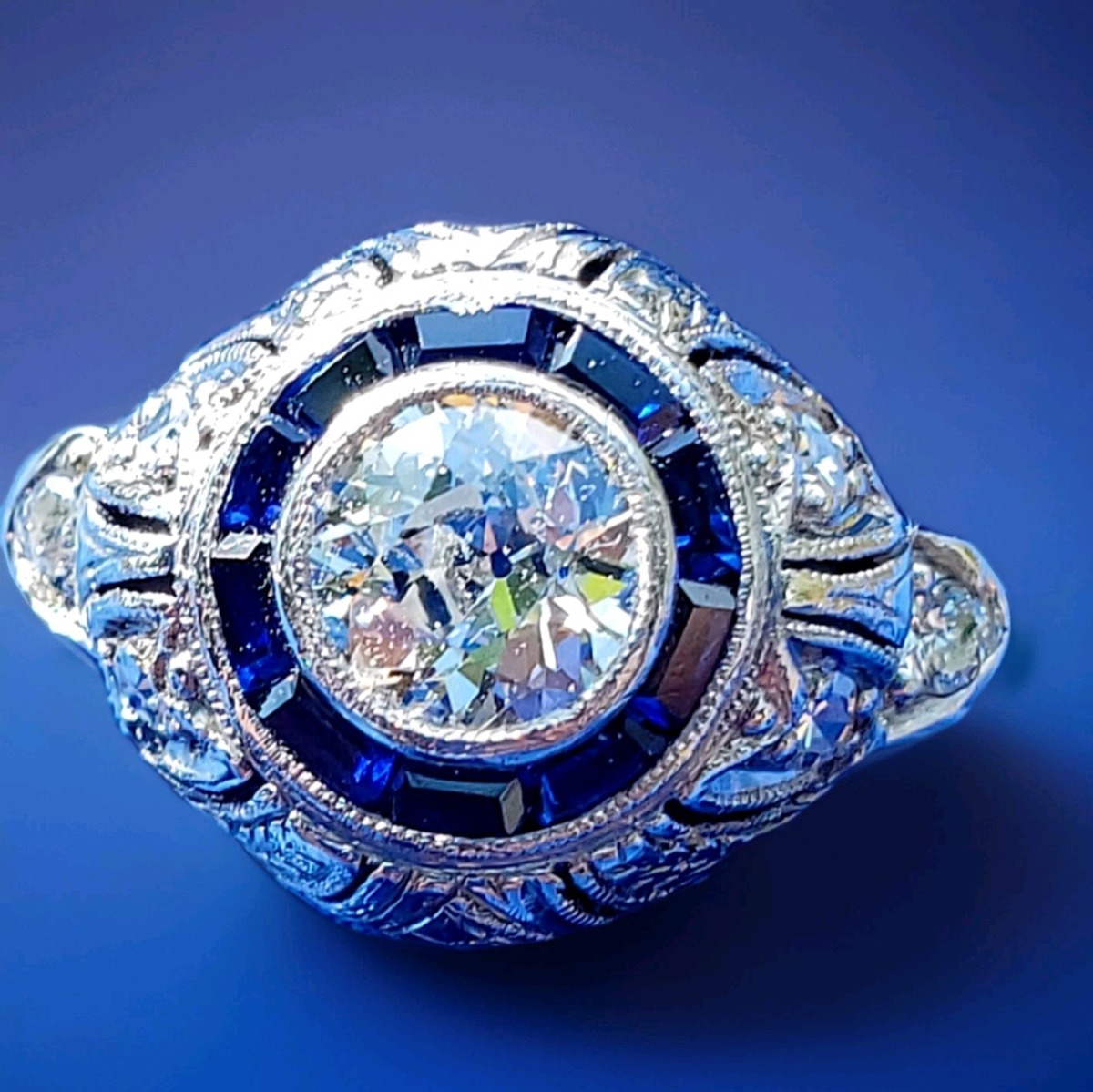 - Earth mined Diamond Sapphire Engagement Ring 1.40 carat Deco Platinum Solitaire