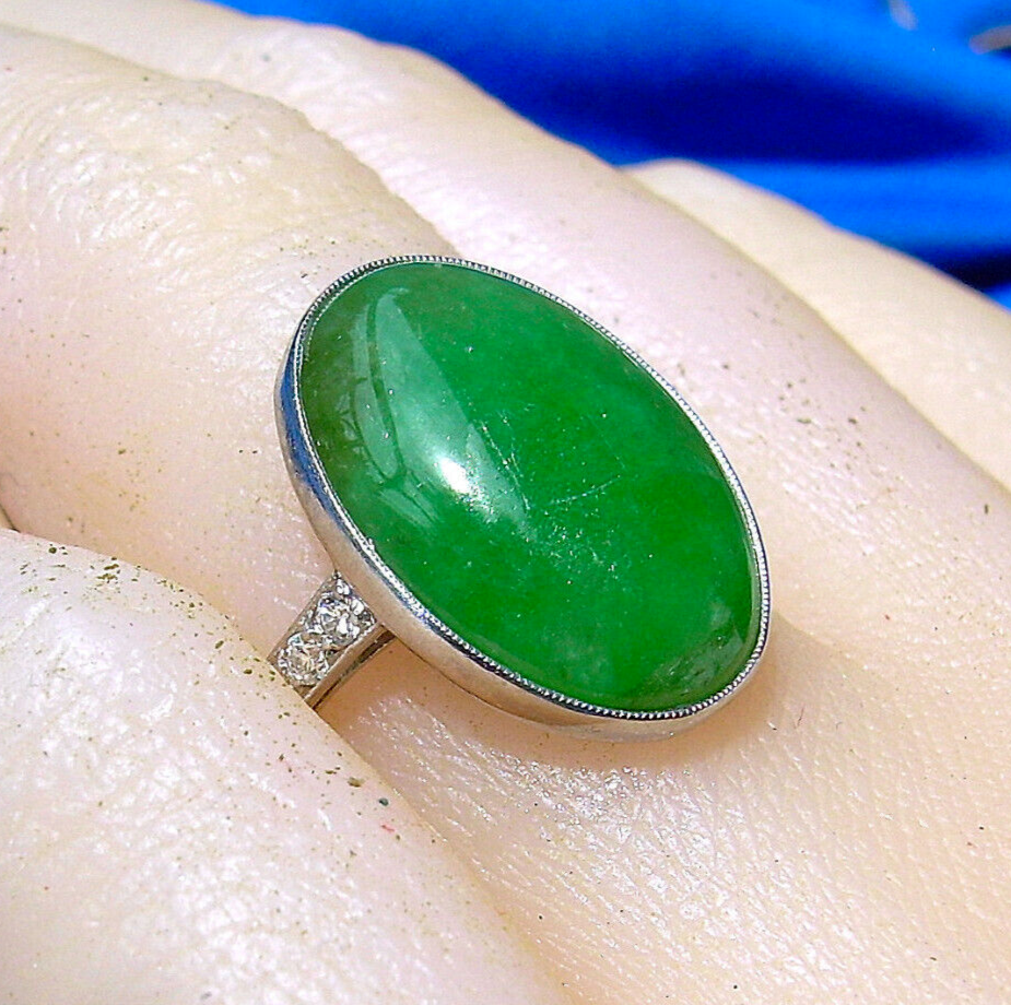 Earth mined Imperial Green Jadeite JADE Deco Engagement Ring Platinum Diamond