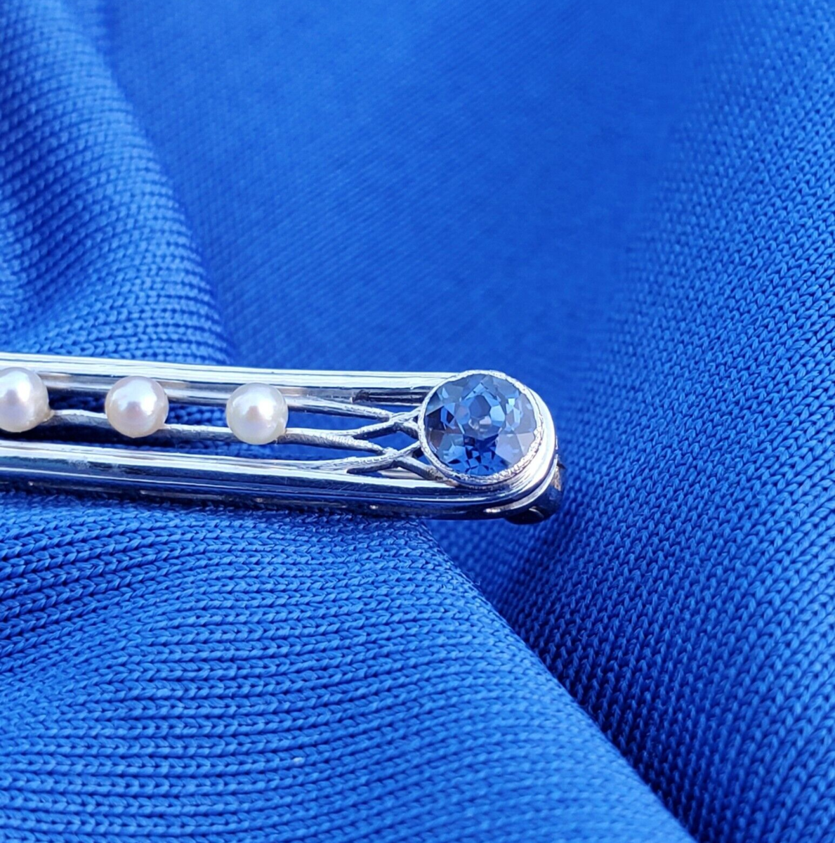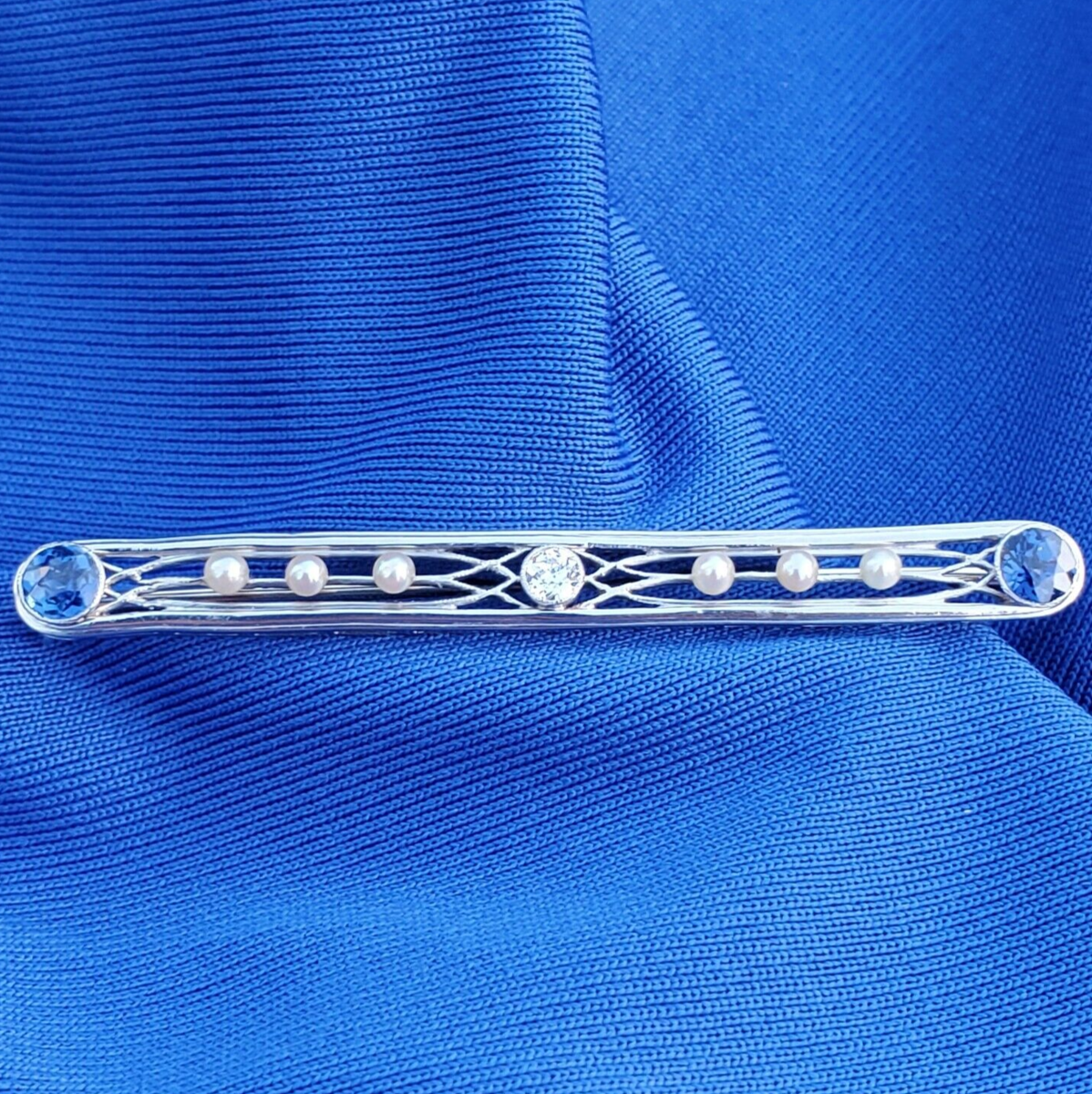 - Earth mined Sapphire Diamond Pearl Deco Bar Pin Vintage Antique Platinum Brooch