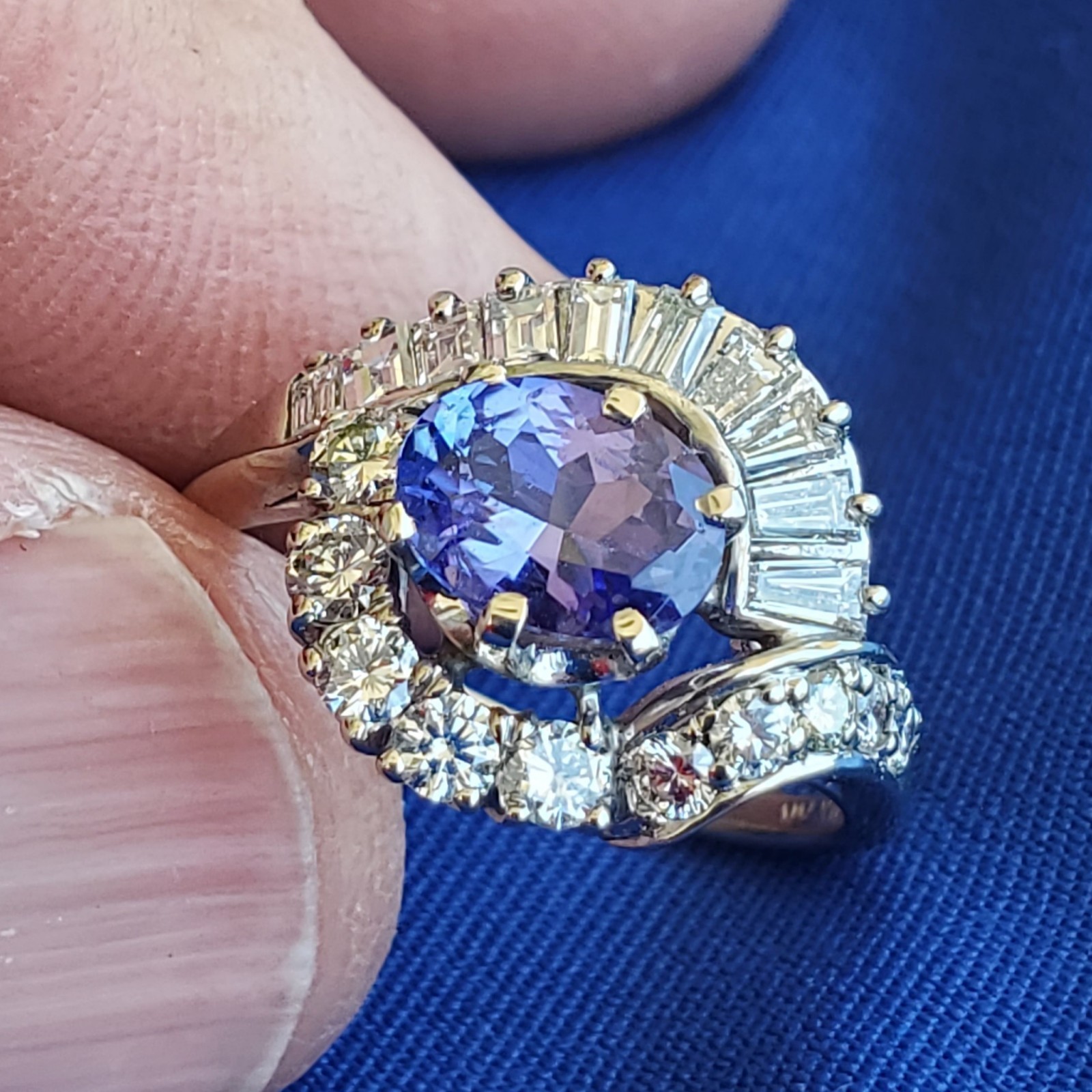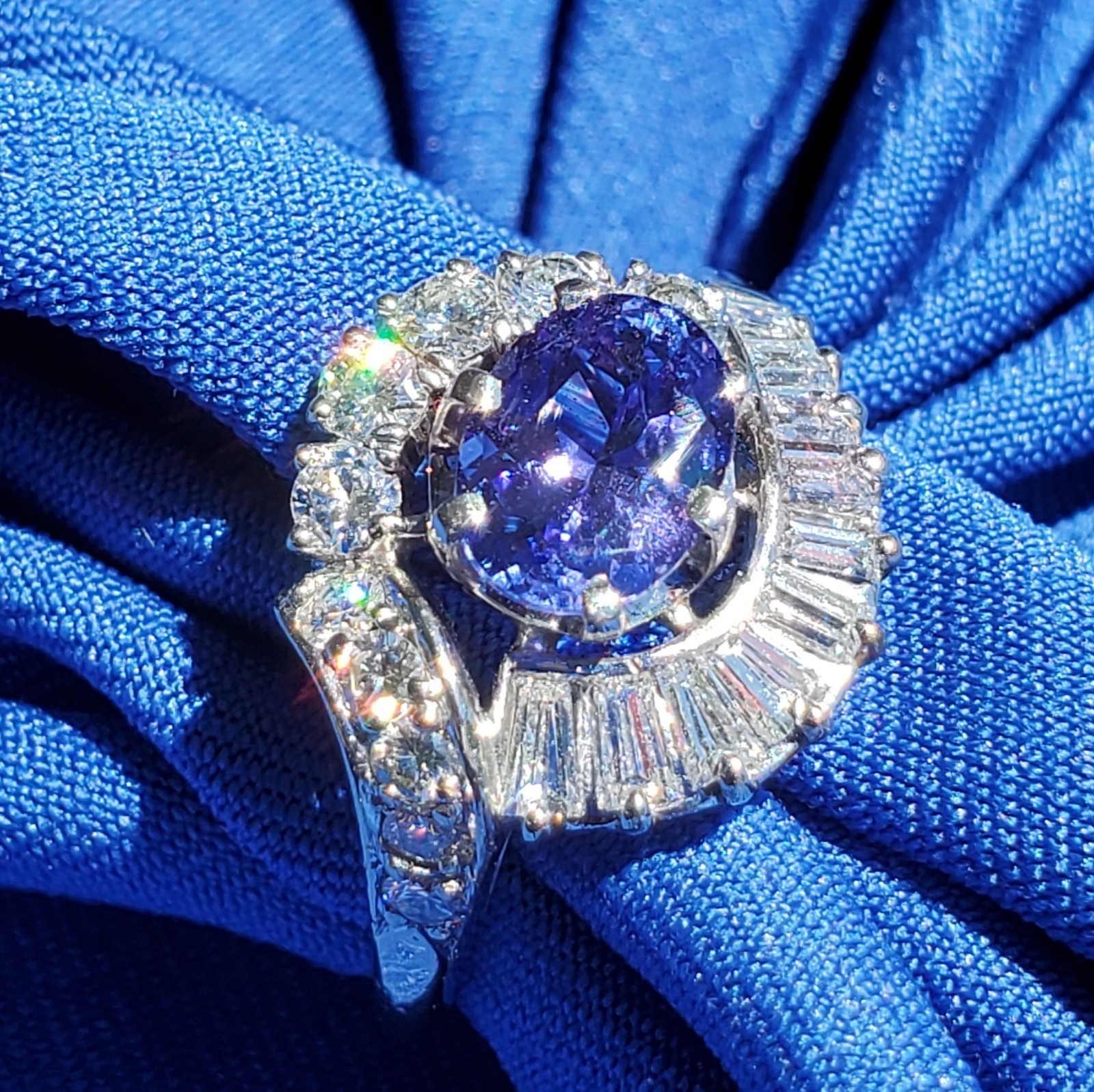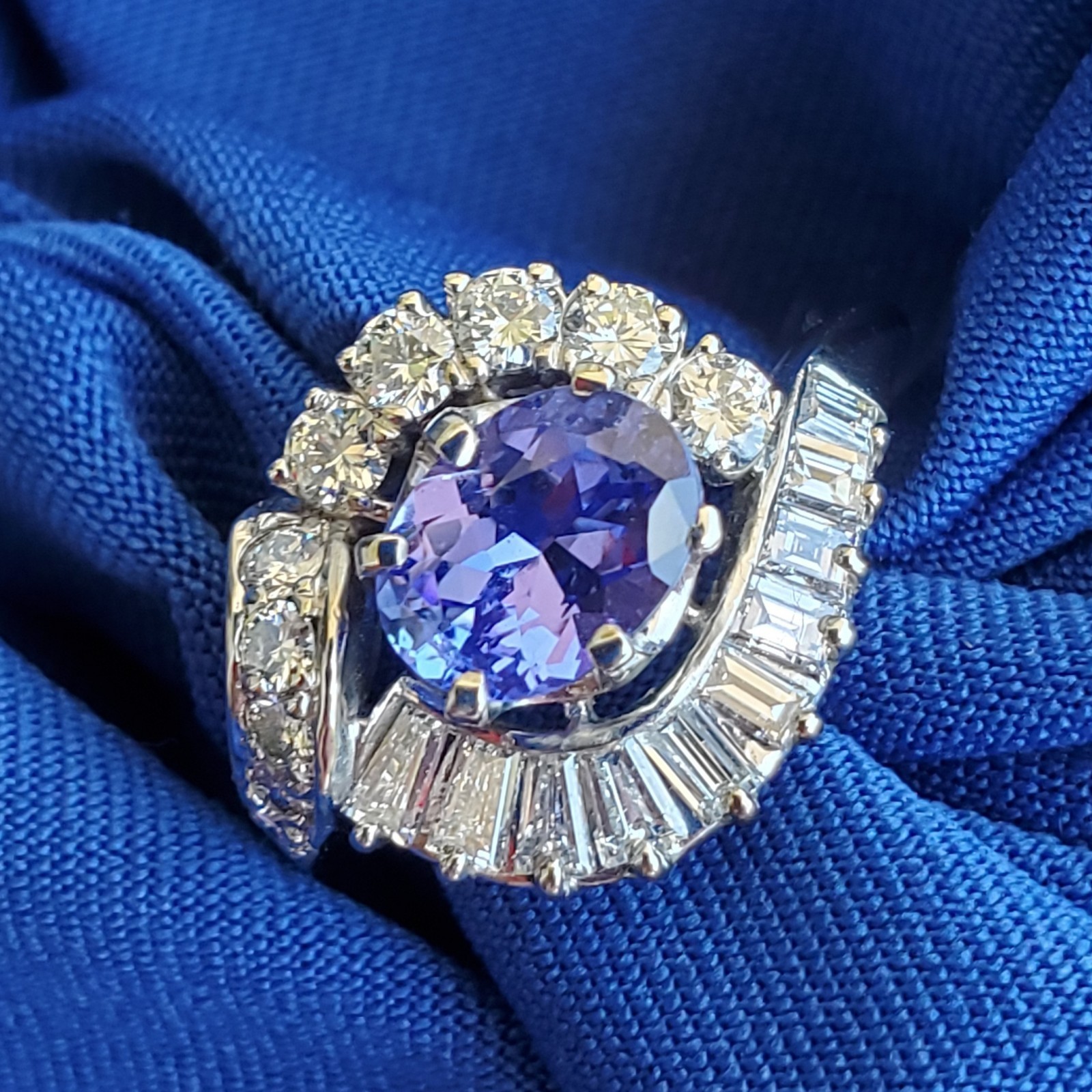 Exciting diamond ring featuring blue purple tanzanite set in solid 14k white gold.