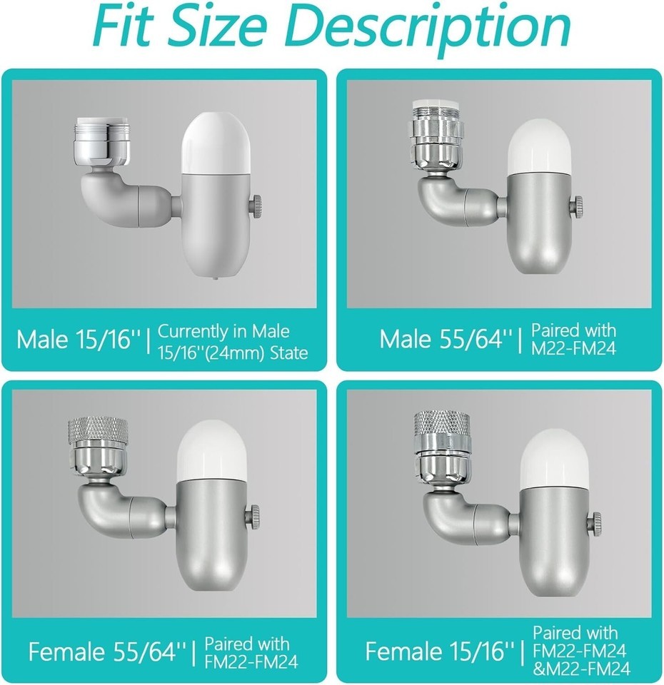 Easy Installation: Adapts perfectly to most types of taps with a male 15/16?? (24mm) connection. The attachment can convert to female 15/16?? (24mm), male 55/64?? (22mm), and female 55/64?? (22mm) effortlessly.