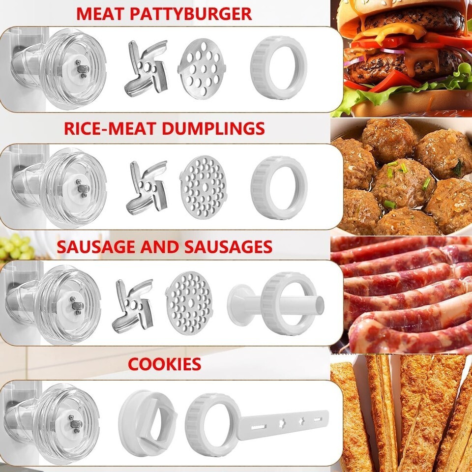Components Included: Sausage Stuffer,Cutting Blade,Grinding Plates,Biscuit Cookie Attachment,Meat Pusher