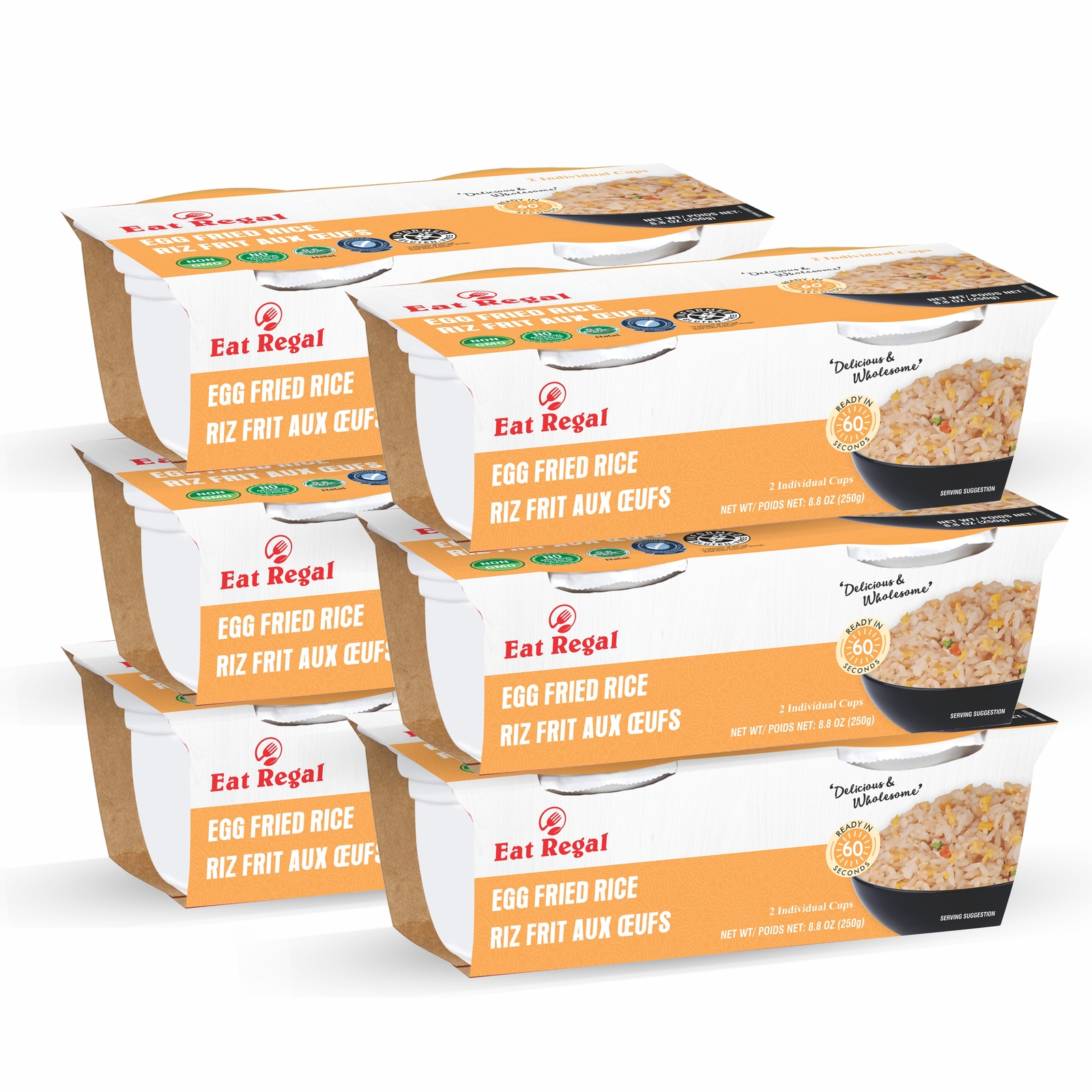 Experience the convenience of restaurant-quality egg fried rice at home with this pack of 6 ready-to-eat cups from Eat Regal Gourmet. Each package contains 2 individual cups of perfectly seasoned egg fried rice that's ready to enjoy in just 60 seconds. The generous 8.8 oz (250g) portions are loaded with fluffy rice, scrambled eggs, tender vegetables, and authentic Asian-inspired seasonings. These individual cups are perfect for quick lunches, easy dinners, or whenever you're craving a satisfying rice dish without the hassle of cooking from scratch. The dual-cup packaging makes portion control simple while keeping the rice fresh until you're ready to heat and eat. Whether you're at work, home, or on the go, these convenient fried rice cups deliver delicious, wholesome flavor in minutes. Stock up with this value pack of 6 containers for those times when you need a quick and tasty meal solution.
