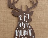 Here is a new Lodge design Deer wall plaque and it is made of a thin wood material and carved out like a buck head with antlers, the front has a nice rustic brown finish and has white lettering that reads a quote down it that says EAT SLEEP HUNT and FISH and has small stars around it,it measures 24 inches high by 13 3/4 inch wide at widest point and is about 1/4 inch thick, is a larger plaque but thin, please measure before you buy please, this would make a nice wall plaque for that hunter or fisherman in a room or in a cabin or lodge