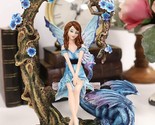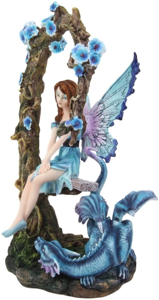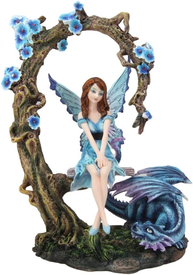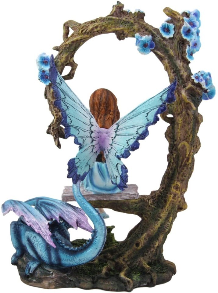 ? This stunning piece is based upon the artwork of Amy Brown, and is full of bold colors and incredible details! A fairy sits upon a tree plank bench, clad in a blue dress and with butterfly wings to match. At her feet, her companion gazes up. The blue dragon is accented in purple, and both match the pretty flowers that bloom along the branch! This figurine is the perfect way to bring a splash of magic right into your home!