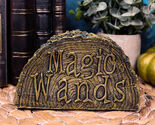 ? In museum-grade resin, this cool wand stand looks like a slice of tree bark with 4 holes radiating along the top and Magic Wands emblazoned on the front. The holes are sized to hold many wood or resin wands and also beautifully holds your favorite pens - words are magic after all.
