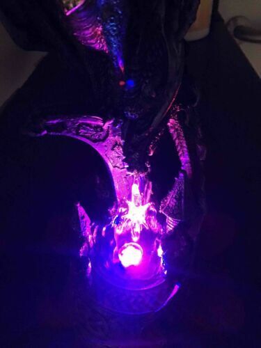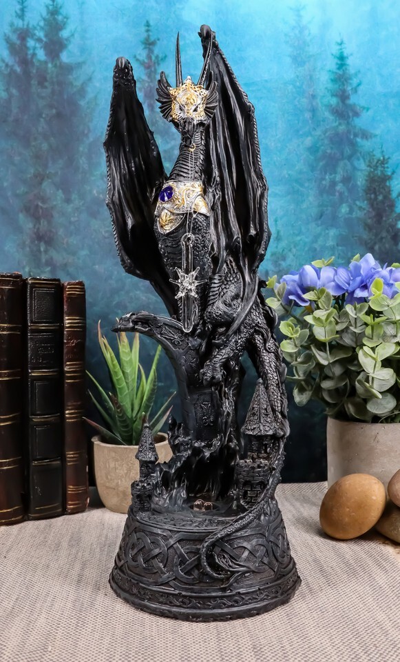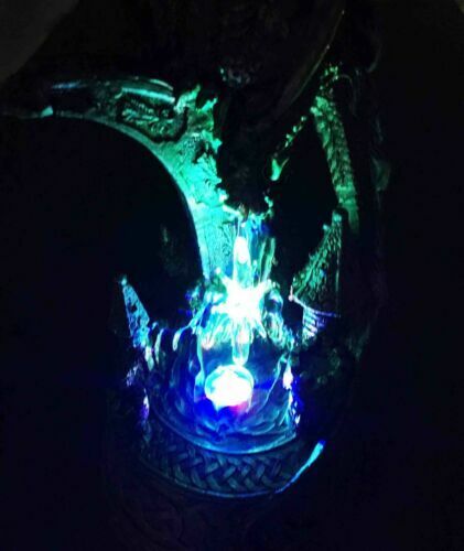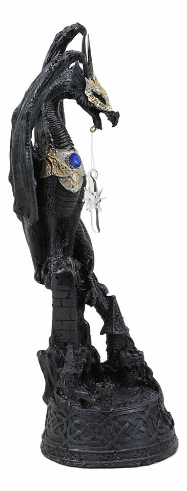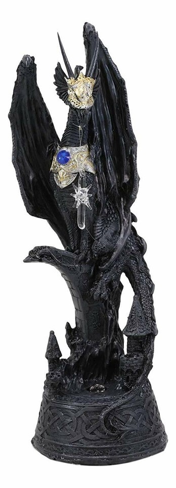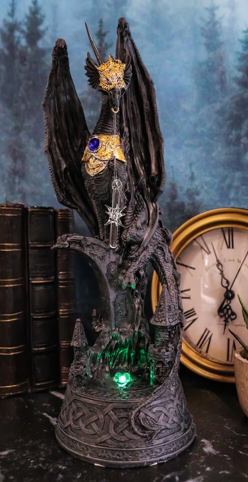 ? The formidable Sapphire Dragon stands atop a mighty fortress castle on a celtic knotwork pedestal stand. The round base is equipped with color changing LED light, giving it a gorgeous illumination when cast on the hovering glass stalactite at the dragon's chest. Use it as a night light to turn your ambiance into a medieval fantasy of dungeons and dragons.