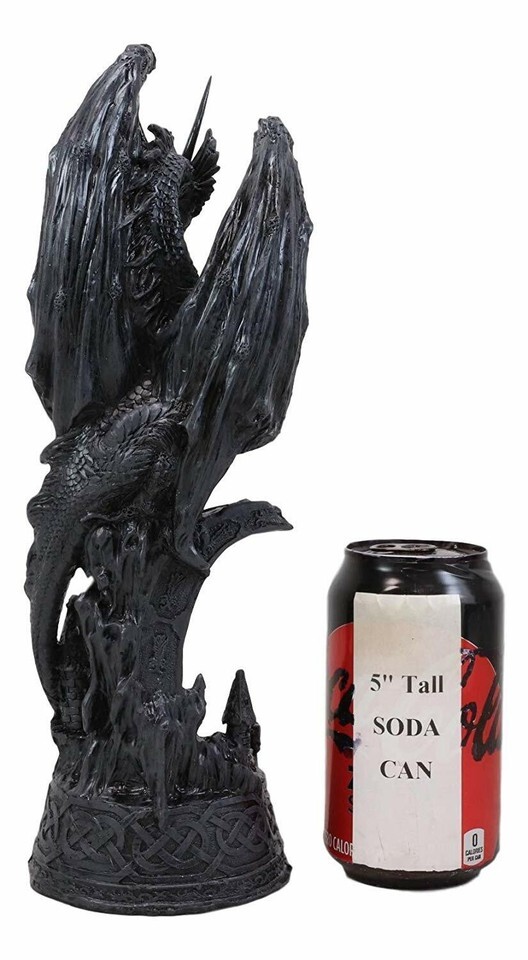 ? This Blue Sapphire Dragon On Castle Pedestal With LED Glass Light Statue stands at 12.5" tall, 4.75" long and 3" deep approximately.