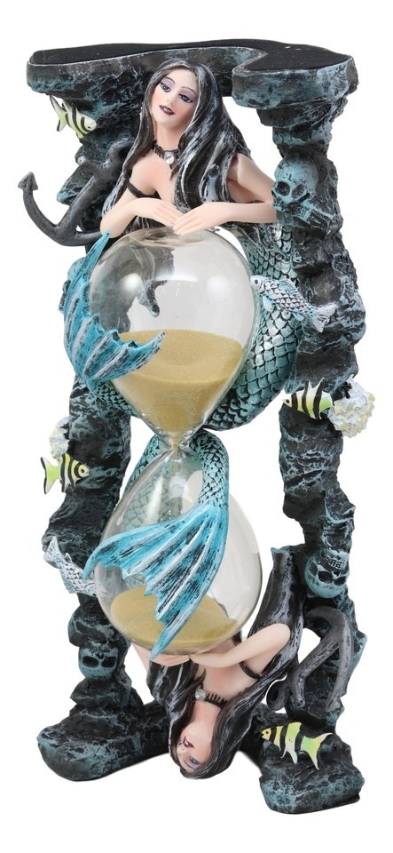 ? This beautiful Mermaid Sand Timer decor features two gothic mermaids on each end of the sand timer wrapping their arms and tails around the glass bulb of the sculpture. The sand timer pillar sculpture consists of skulls of necromancy, sunken ship anchors, deep ocean fishes and corals. These mermaids are sirens of the seas, notorious for their luring beauty and deadly appetite for human flesh.