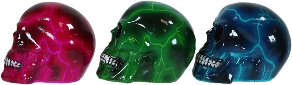 ? Add the spirit of rock and roll and metallica to your macabre decore with these mini skulls. Perfect for your desktop, shelf or what have you, these skulls bring the fear factor to your ambiance. These skulls come in the colors of green, blue and red. The skulls are embellished with lightning bolts all around the surface to boost your imagination!