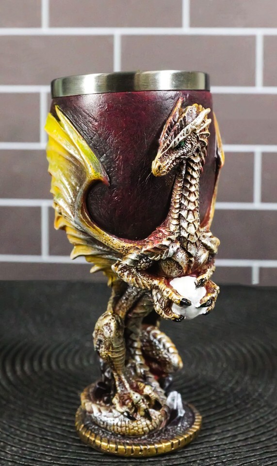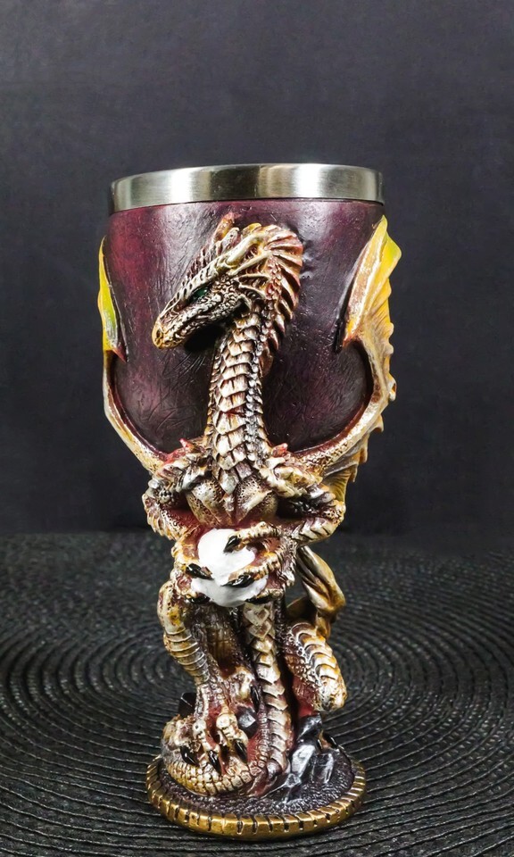 ? This Dragon With Egg Wine Goblet is made of fine polyresin and stainless steel, hand painted and polished individually.