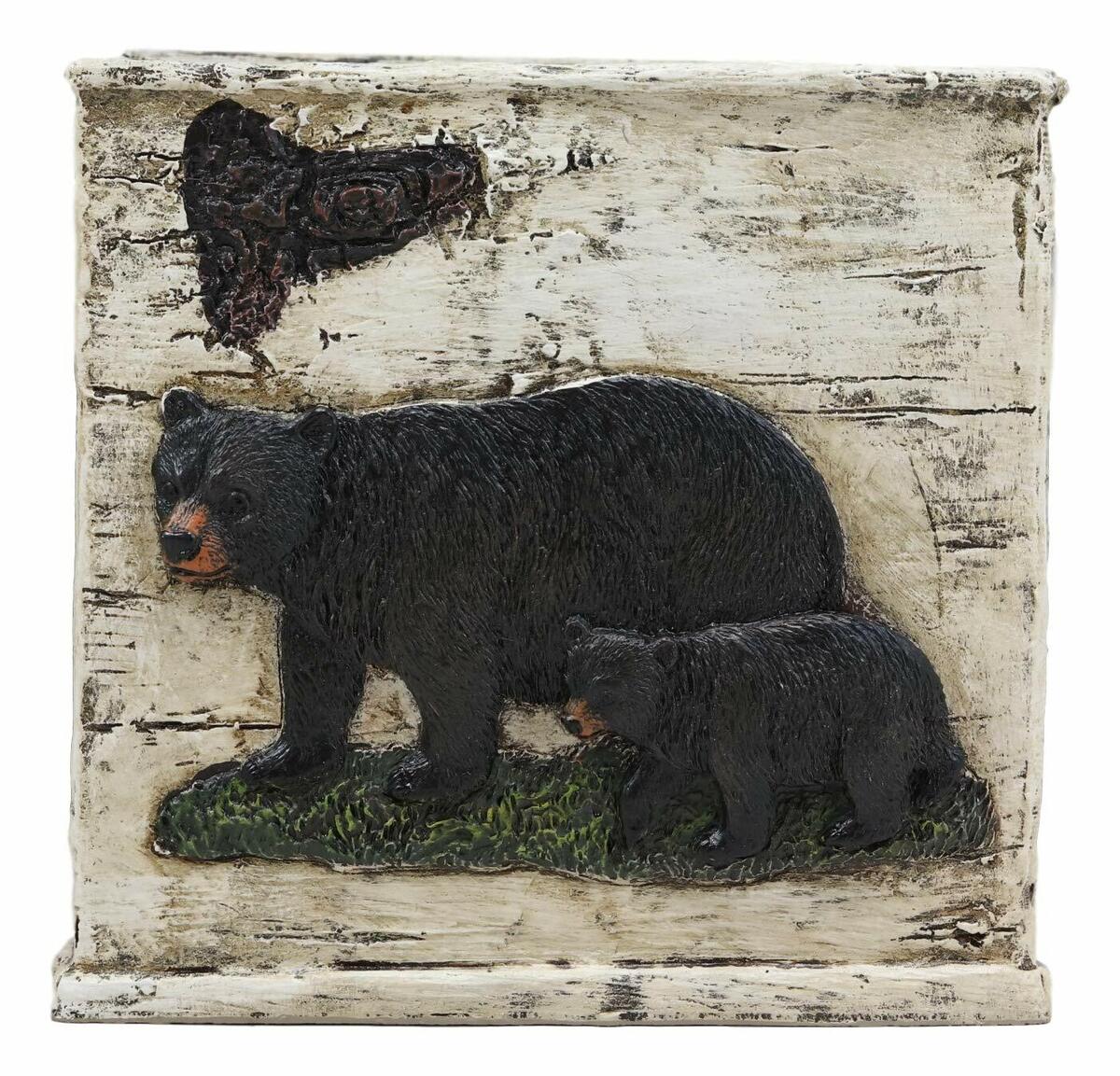 ? Why settle for an ordinary cubic tissue box cover for your rustic bathroom, living room or powder room? You don't have to with this intricately detailed black bear themed figurine featured in rustic textured birch wood finish. Built with quality construction, weighing about 2 pounds, this tissue box cover is un'bear'ably adorable featuring a mother bear with her cub in the pine tree forest.