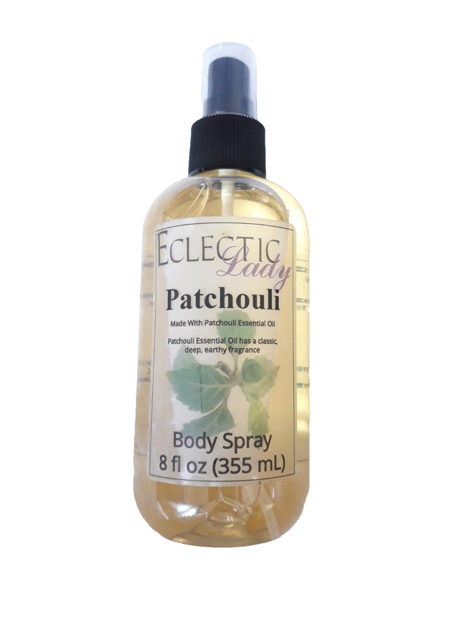 Eclectic Lady Patchouli Body Spray (8 fl oz) is a hydrating mist infused with patchouli essential oil, offering a deep, earthy scent and light skin moisture.