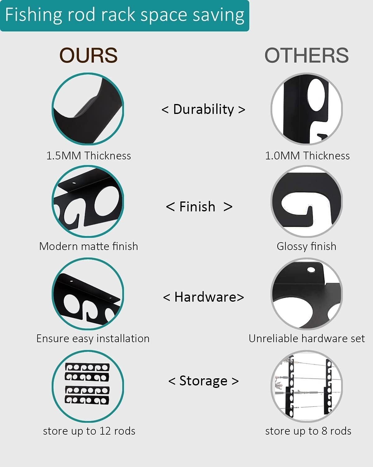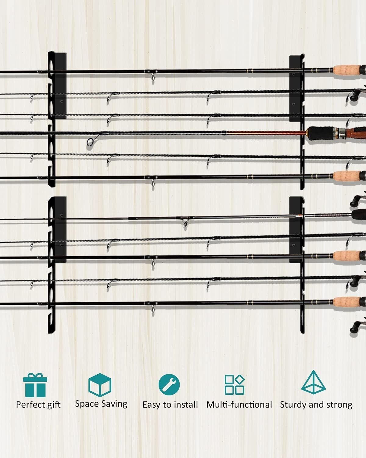 Keep your fishing gear organized with our sturdy, versatile 12-rod storage rack. Designed with deep groove cuts for easy access, it securely holds up to 12 rod and reel combos, preventing damage and clutter. Crafted from heavy-duty steel and finished with a protective black powder coating, it offers lasting durability and resistance to corrosion and scratches. Easy to install with included hardware, this rack can be mounted on the wall or ceiling?perfect for garage, home, cabin, or boat storage. Maximize your space and extend the lifespan of your fishing rods with this space-saving, reliable storage solution.