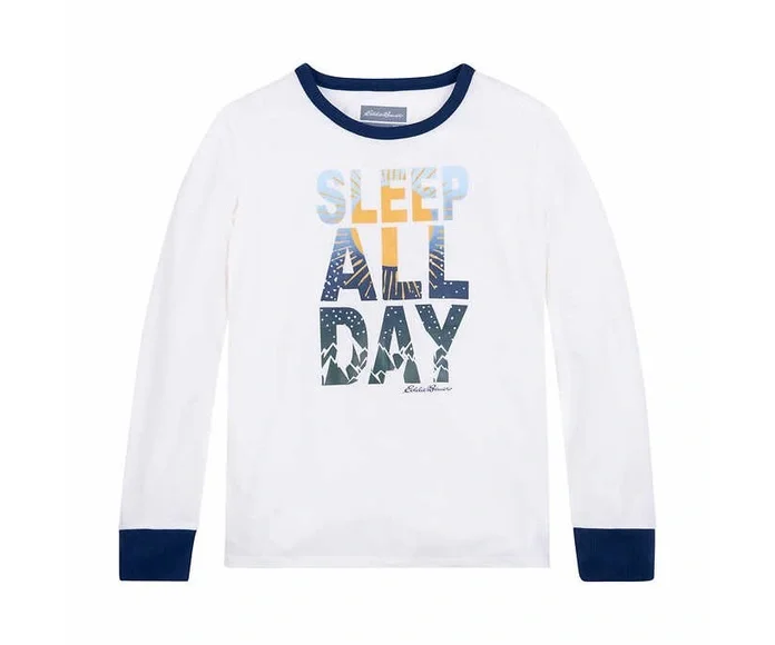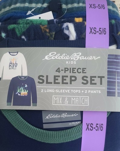 This sale is for one (1) Eddie Bauer Kids Sleep Set Size (XS) 5-6 "Sleep All Day" Two (2) Long Sleeve Tops/Tees Two (2) Fleece Pants Neck arm detailing 100% Polyester Flame resistant Pullover tops Drawstring closure on pants Machine wash ~ Tumble dry Pajamas are new in original packaging Please view photos for a good description of this item Thank you!