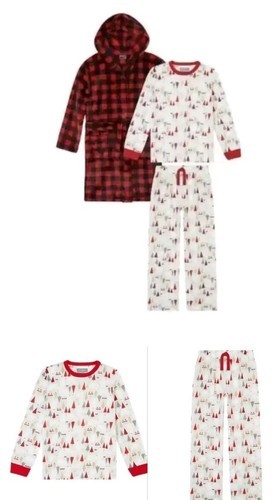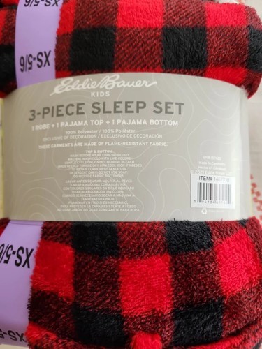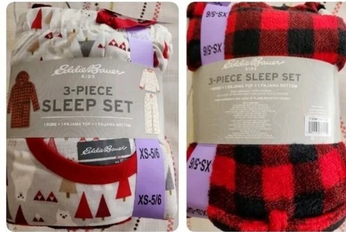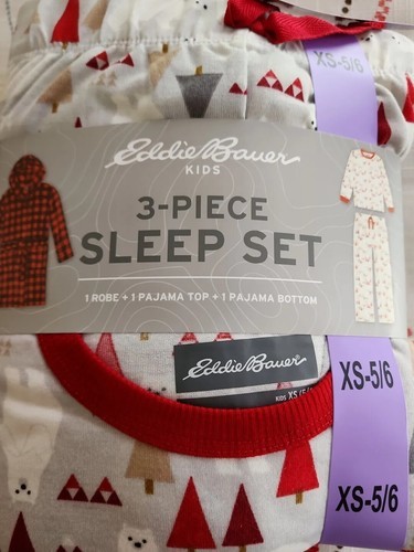 This sale is for one (1) Eddie Bauer Kids Sleep Set Size (XS) 5-6 Three (3) Piece Set to Include: One (1) Bathrobe ~ Red Black in Color ~ Buffalo Plaid Pattern One (1) Pullover Pajama Top ~ Creme Background ~ Bear Tree Design Throughout One (1) Pull-On Pajama Bottom ~ Elastic Waistband w/Faux Drawstring ~ Bear Tree Design Throughout 100% Polyester Flame resistant Machine wash ~ Tumble dry Pajamas are new in original packaging Please view photos for a good description of this item Thank you!