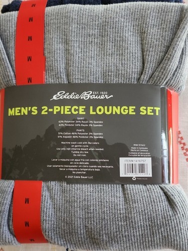 This Sale is for One (1) Eddie Bauer? Lounge Set Men's Size Medium Gray ~ Crew Neck ~ Pullover ~ Long Sleeve ~ Waffle Top Blue ~ Elastic Drawstring Waistband Pants ~ Side Pockets ~ Fleece Item #1416757 Shirt is 63% Polyester ~ 34% Rayon ~ 3% Spandex Pants are 51% Cotton ~ 46% Polyester ~ 3% Spandex Relaxed Fit Machine wash ~ Tumble dry This lounge set is new with tags Please view photos for a good description of this set Thank you!