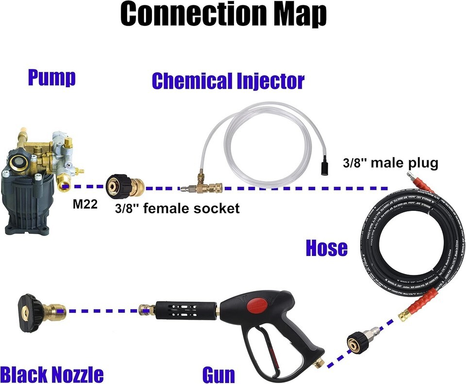 Items Included: Kit,Chemical injector,10 feet tubing (siphon hose),Filter,Black soap nozzle,Pressure washer accessory