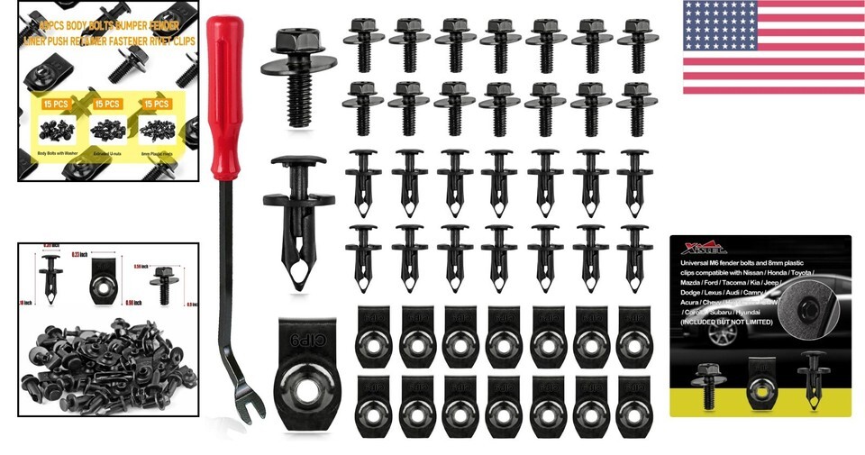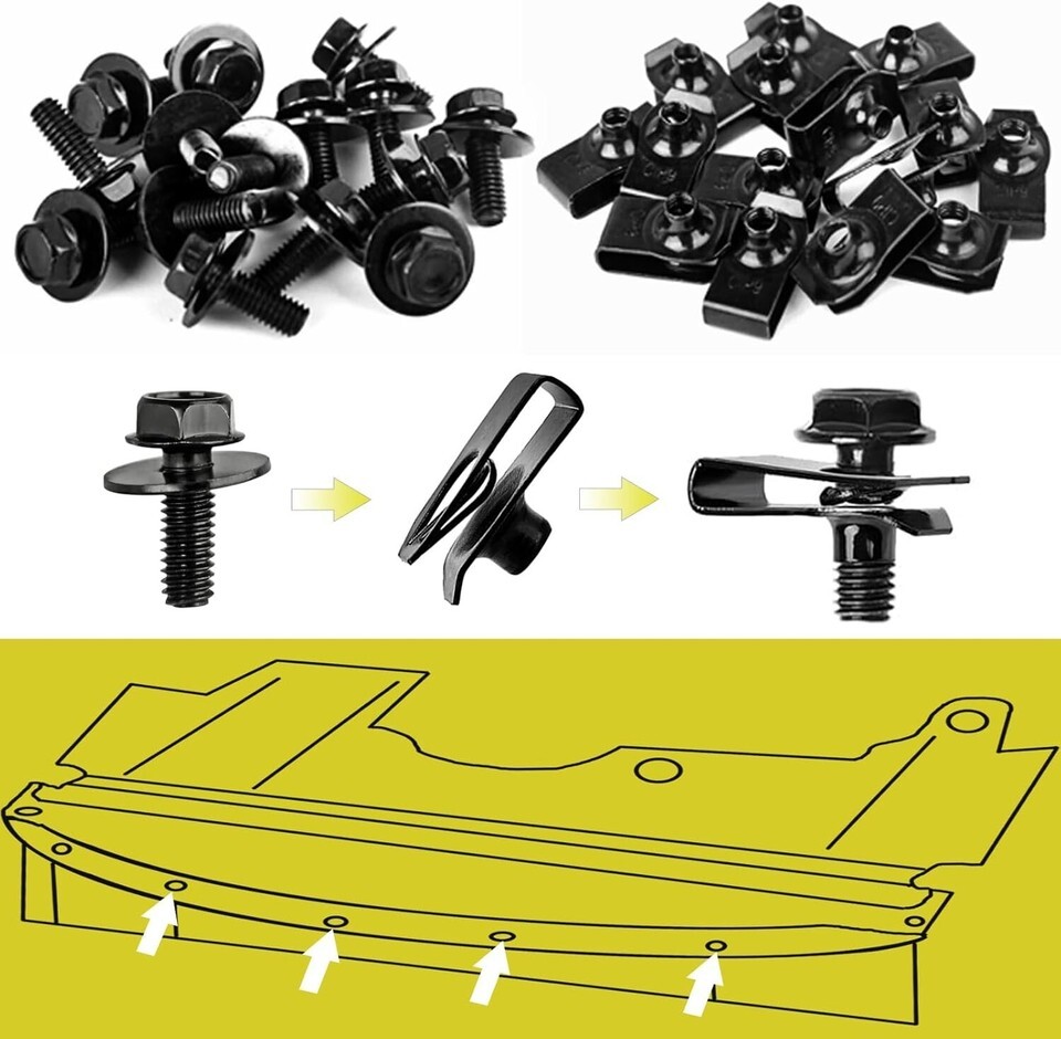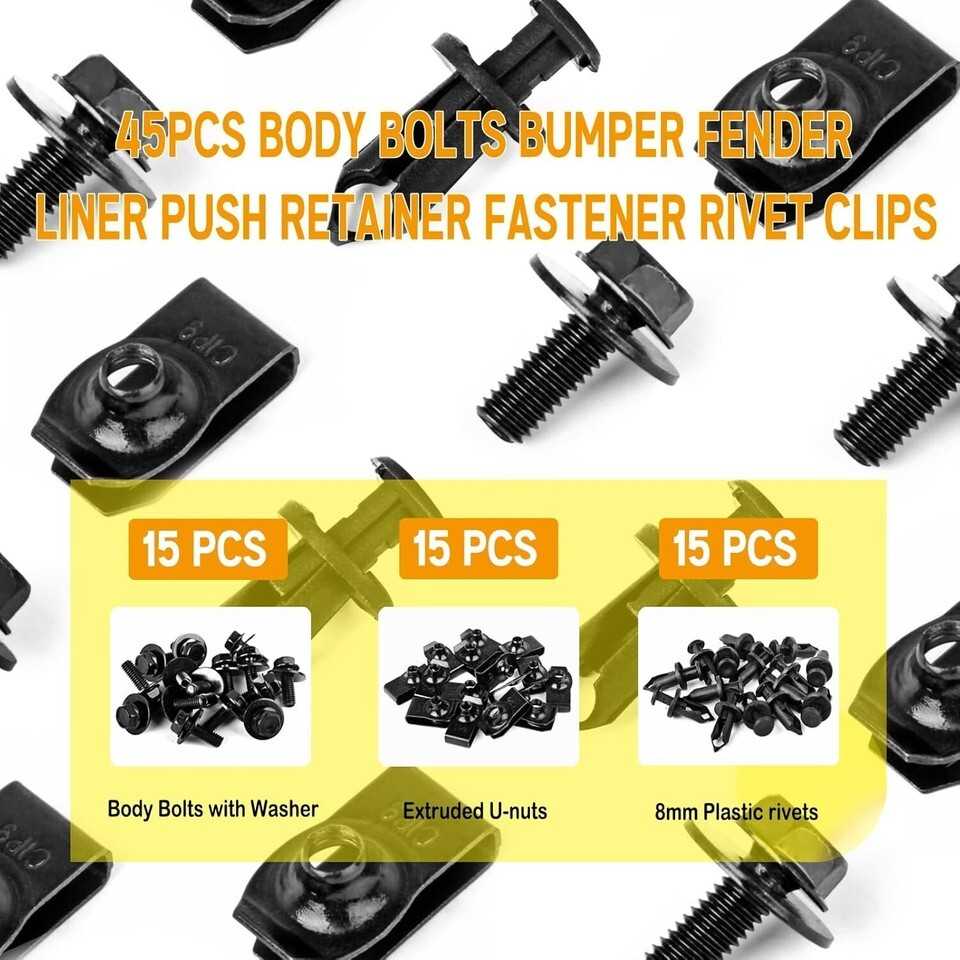 Comprehensive Package: Each set includes 15 extruded U-nuts, 15 body bolts with built-in fender washers, and 15 plastic push clips, providing everything you need for a complete repair solution.