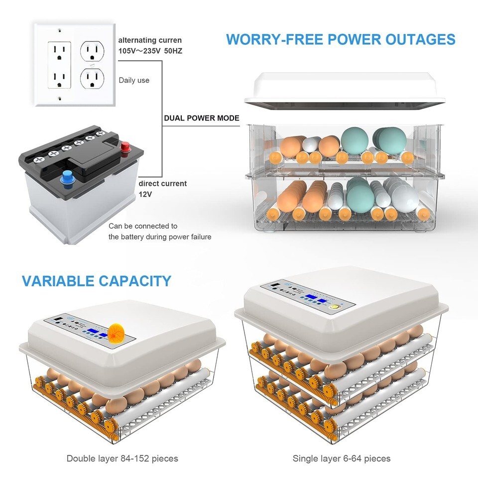 Reliable Dual Power Supply ? Operates on standard 110V power with automatic 12V battery backup in case of outages (battery not included), ensuring uninterrupted incubation.