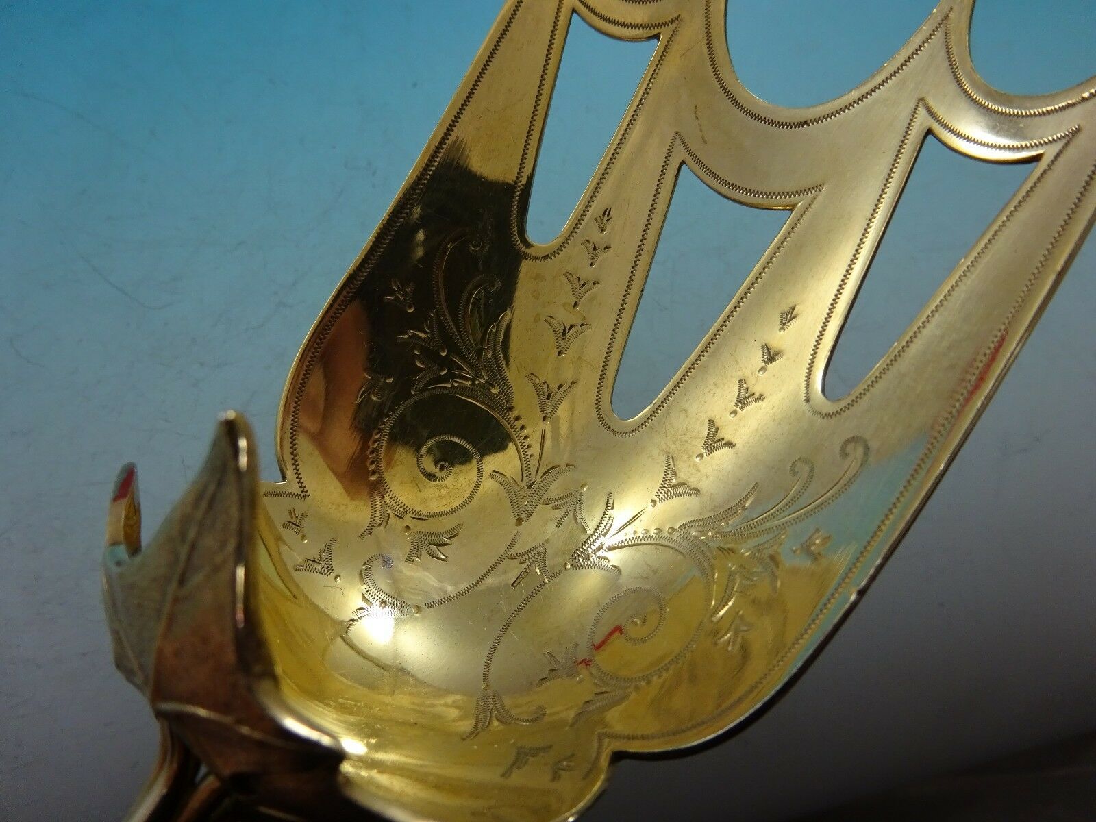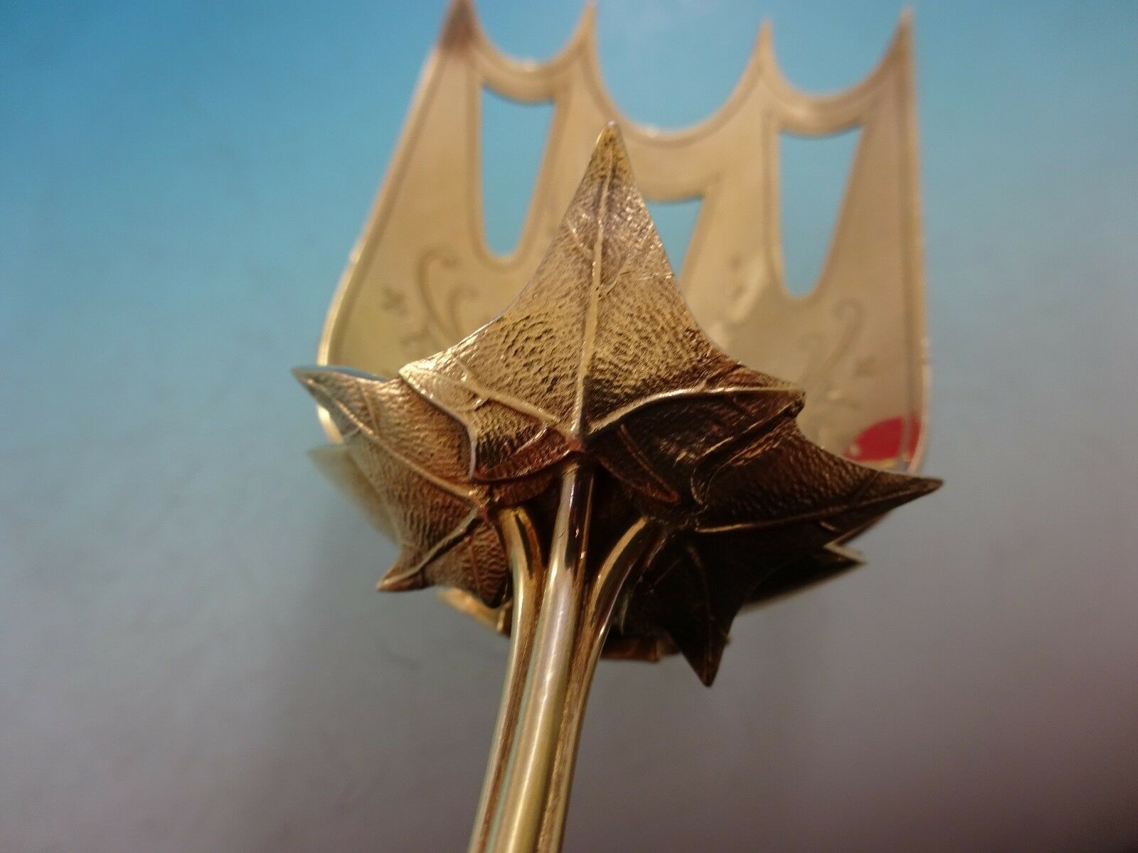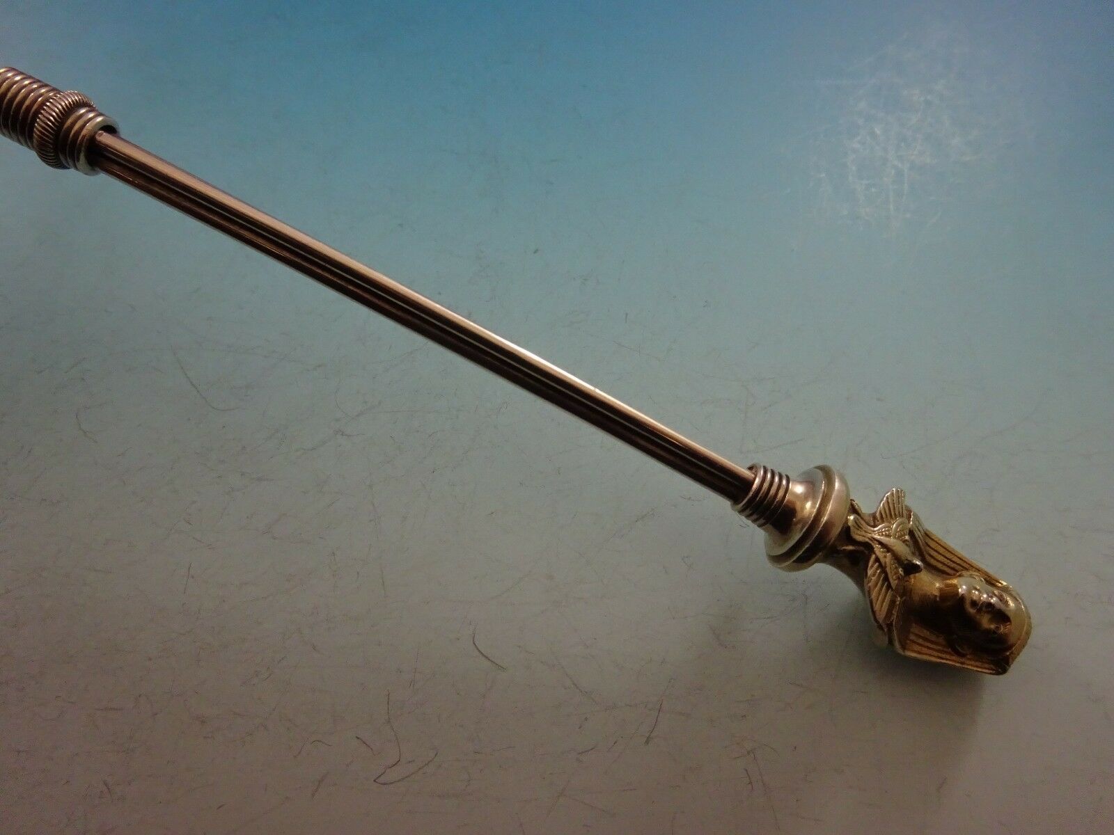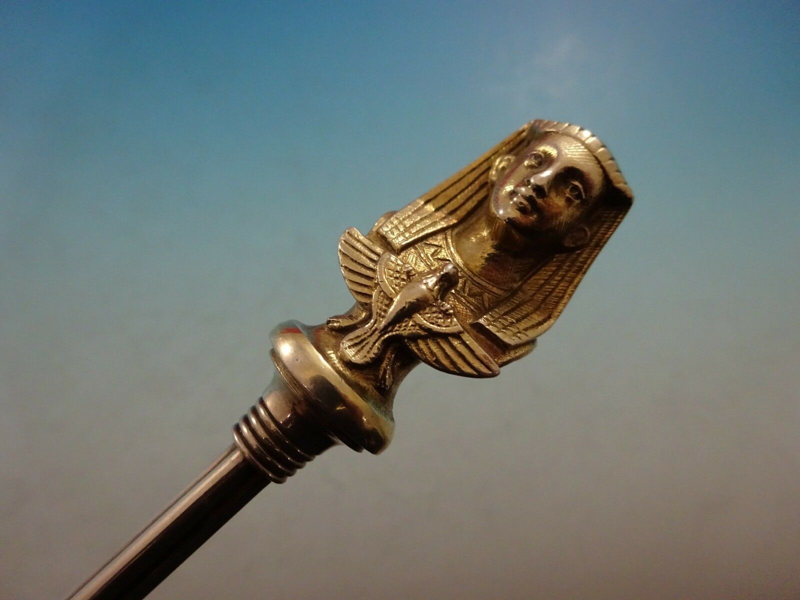 This unusual sterling silver Egyptian Revival by Wendt buffet fork features a 3D Egyptian head with intricate detail. The serving area has a bright gold wash with brite-cut detail in the bowl and on the tines. Ivy leaves make up the bowl of this lovely serving fork and circle around the back. It measures 10 1/4" long. It is not monogrammed and in excellent condition.
