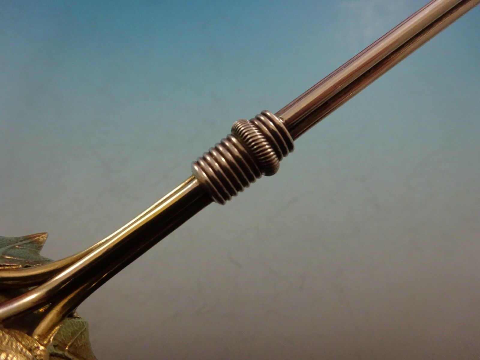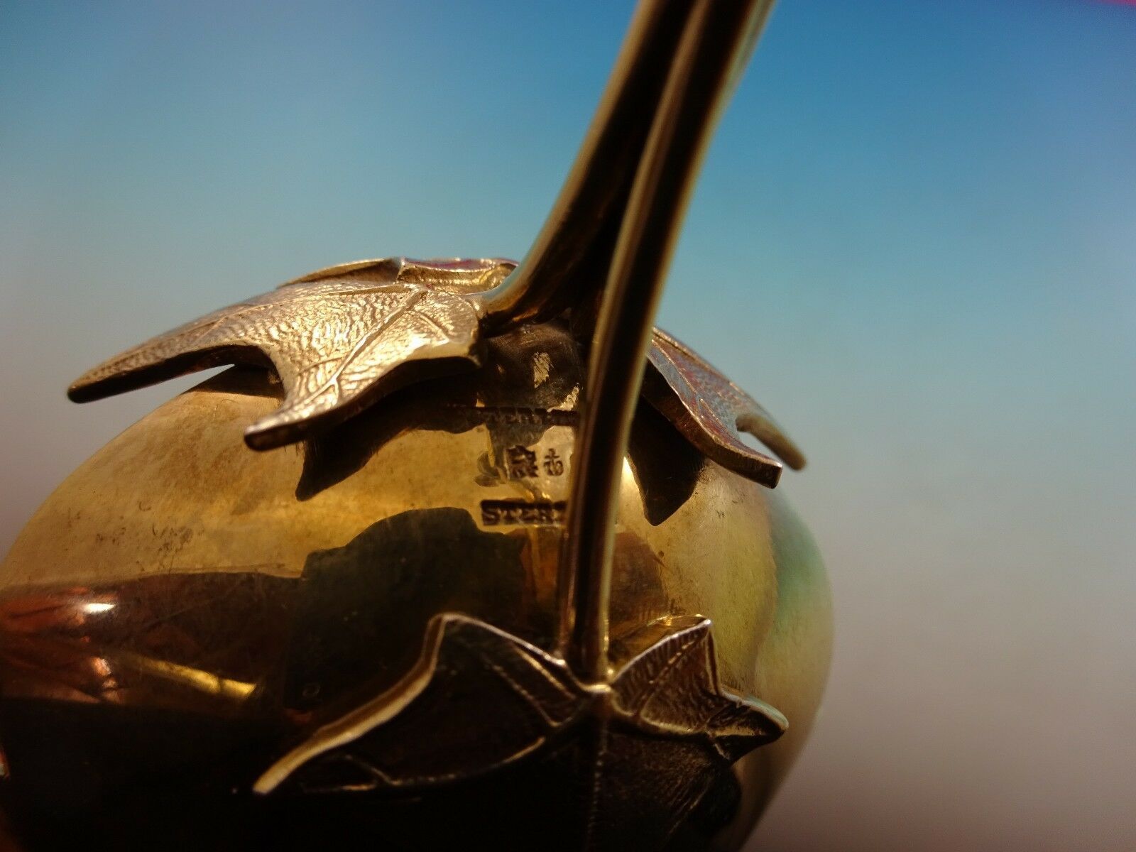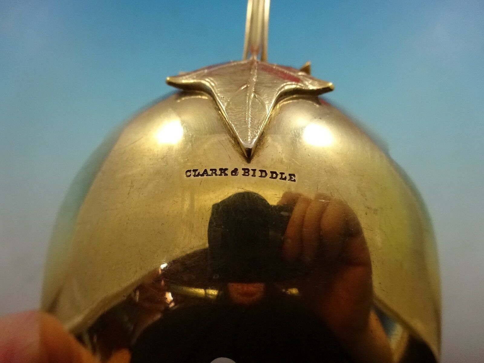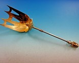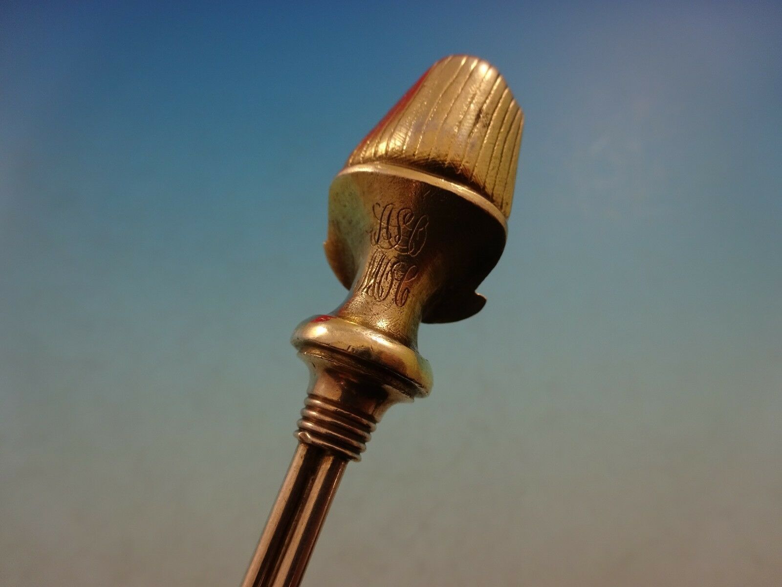 This unusual sterling silver Egyptian Revival by Wendt buffet fork features a 3D Egyptian head with intricate detail. The serving area has a bright gold wash with brite-cut detail in the bowl and on the tines. Ivy leaves make up the bowl of this lovely serving fork and circle around the back. It measures 10 1/4" long. It is not monogrammed and in excellent condition.