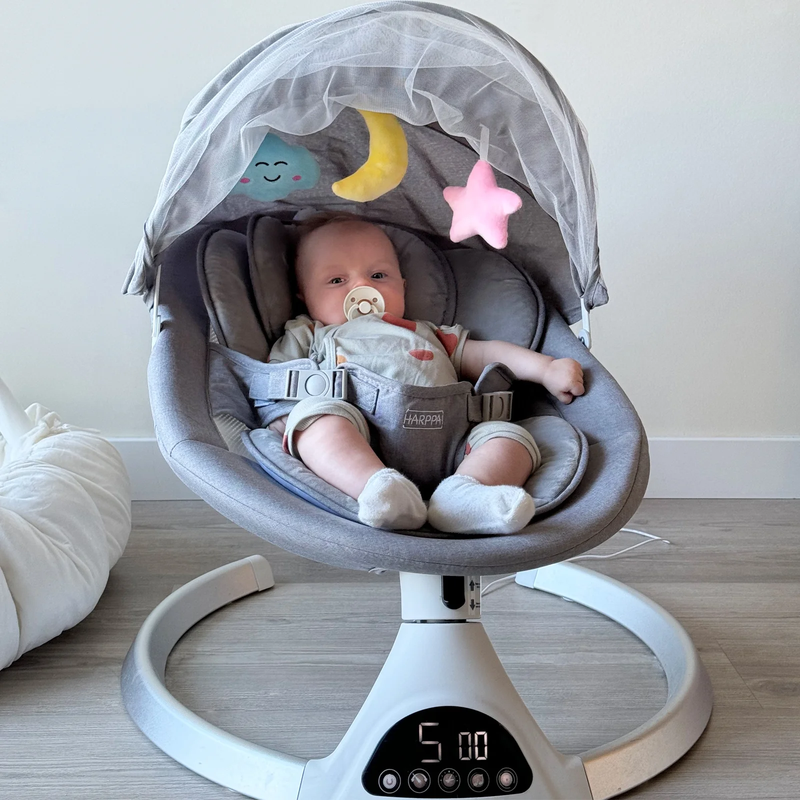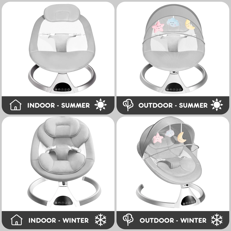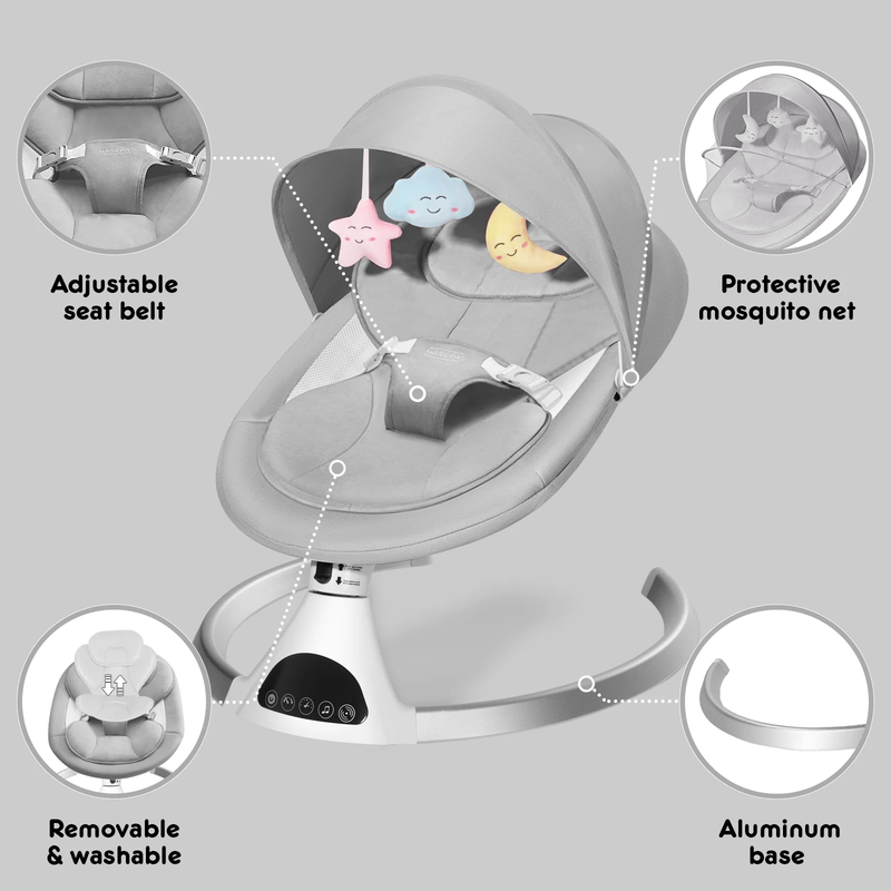 Enjoy the convenience and comfort of this Electric Baby Swing for Infants. This portable bouncer features 5 swing speeds, 3 timer functions, and a Bluetooth music speaker with 12 built-in songs to soothe and entertain your little one. The 3-point harness, anti-skid aluminum base, and detachable mosquito net ensure your baby's safety and comfort. With its lightweight and travel-friendly design, our baby swings allows you to multitask while your baby enjoys a calming, secure, and entertaining experience. Suitable for infants weighing 9-20 lbs and 0-6 months old.