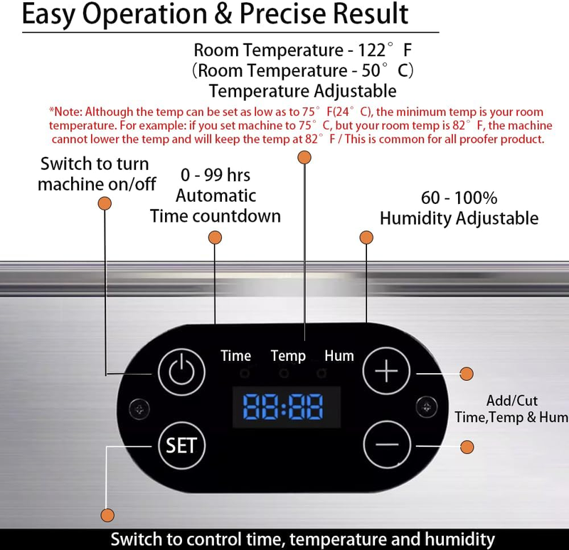 Independent and accurate humidity control and time countdown, humidity control for a range of room humidity % ~ 99%, precise humidity control helps you stick with your recipe and eliminated the need for tedious adjustment, no more dough dry crust. The 0 - 99 hrs timing control respond to the needs of different recipe requirements, you can also set it as long as you want (for the most 99hrs) for continuous work for some recipe such as yogurt fermentation.