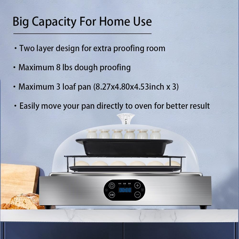 Upgraded capacity with now two layers. The internal space of the fermentation proofing box is 16.14L x 12.2W x 11H inches, the internal large capacity unlocks more recipes, you can directly place the baking tray or dough tray, toast mold, and other tools, and replace to the oven after fermentation for better results. It can load up to 3 standard loaf pan or 2 proofing pan.