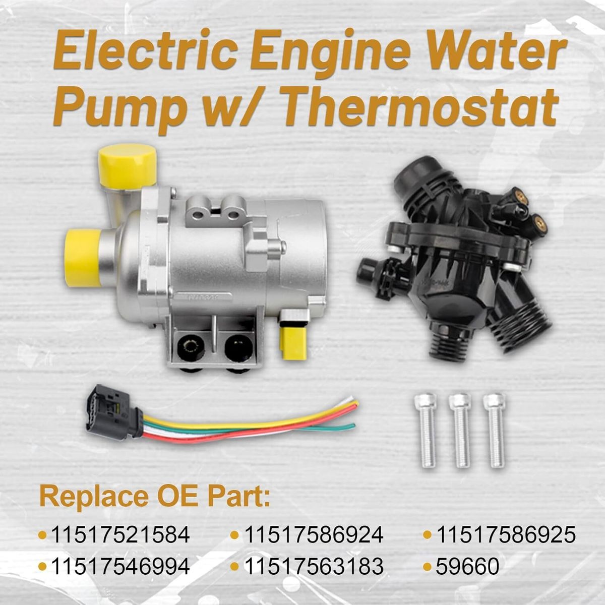 Reliable Direcly replacement - Water Pump and Thermostat have undergone extensive quality and safety performance testing Water Pump Assembly Replace Part Number: 11517546994 11517563183 11517586924 11517586925 59660 11517521584 Manufactured with the highest quality materials to create a strong, corrosion resistant body design Package Includes: Comes with1 Electric Engine Water Pump and 1 Thermostat 30-Day warranty, true worry-free shopping experience. If you have any problem, feel free to contact us