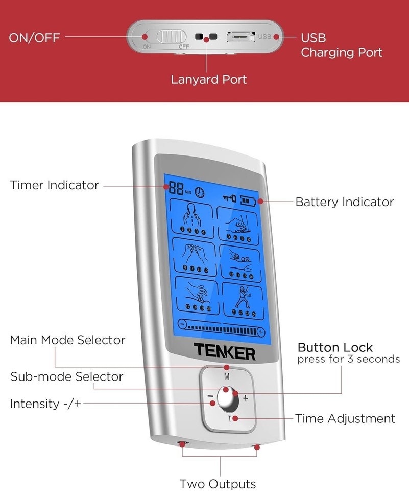 USB cable information AC:100-240V DC:5V/0.5A 1A 1.5A 2A USB to micro-usb cable. TENKER TENS can be connected to a wall socket or USB outlet to charge.