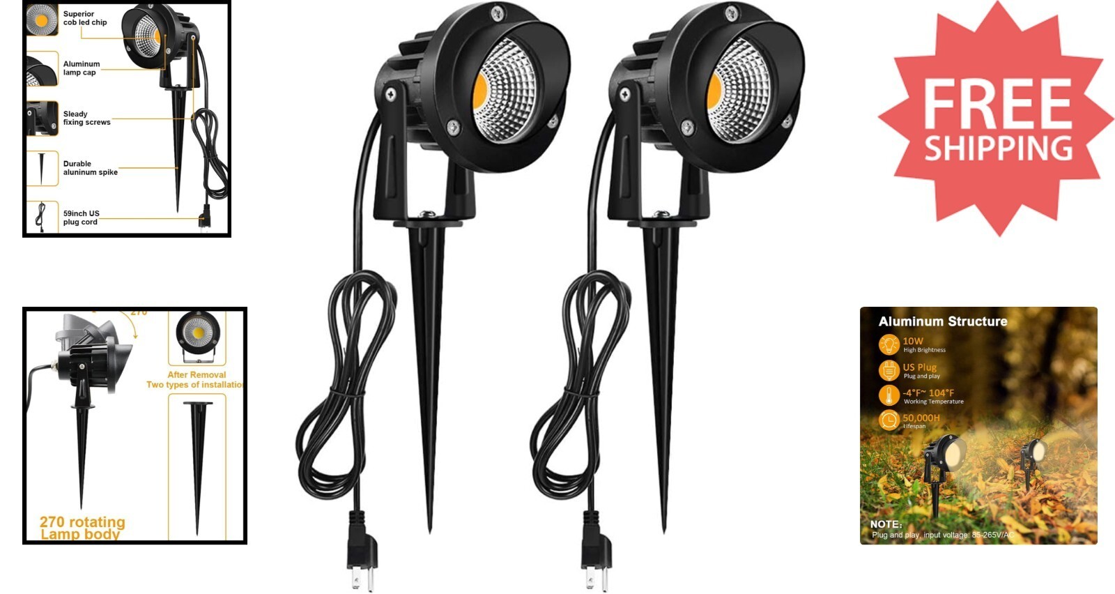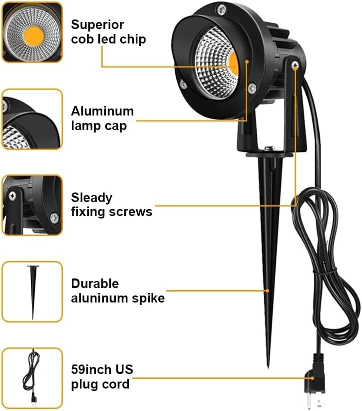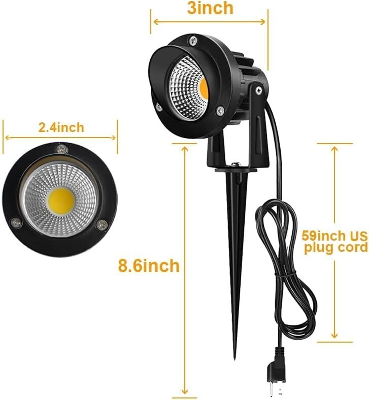 Illuminate your outdoor spaces with our upgraded 10W LED Landscape Spotlight, delivering up to 1100 lumens of high-brightness light using advanced COB LED chips. Designed for versatility, it features a 270-degree adjustable bracket, a 59-inch US power cord for easy plug-and-play setup, and a durable die-cast aluminum body for long-lasting performance. With a warm white 3000K glow, waterproof rating, and an impressive lifespan of up to 50,000 hours, this spotlight is perfect for gardens, lawns, driveways, and more. Enjoy energy-efficient lighting with simple installation and peace of mind thanks to our 3- .