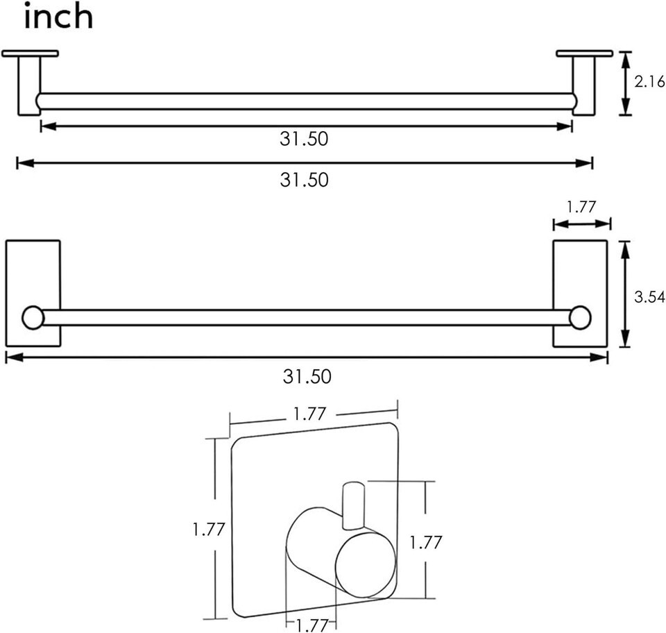 Size Specifications: Towel bar measures 32" in length, while each hook measures 1.7" x 1.7".