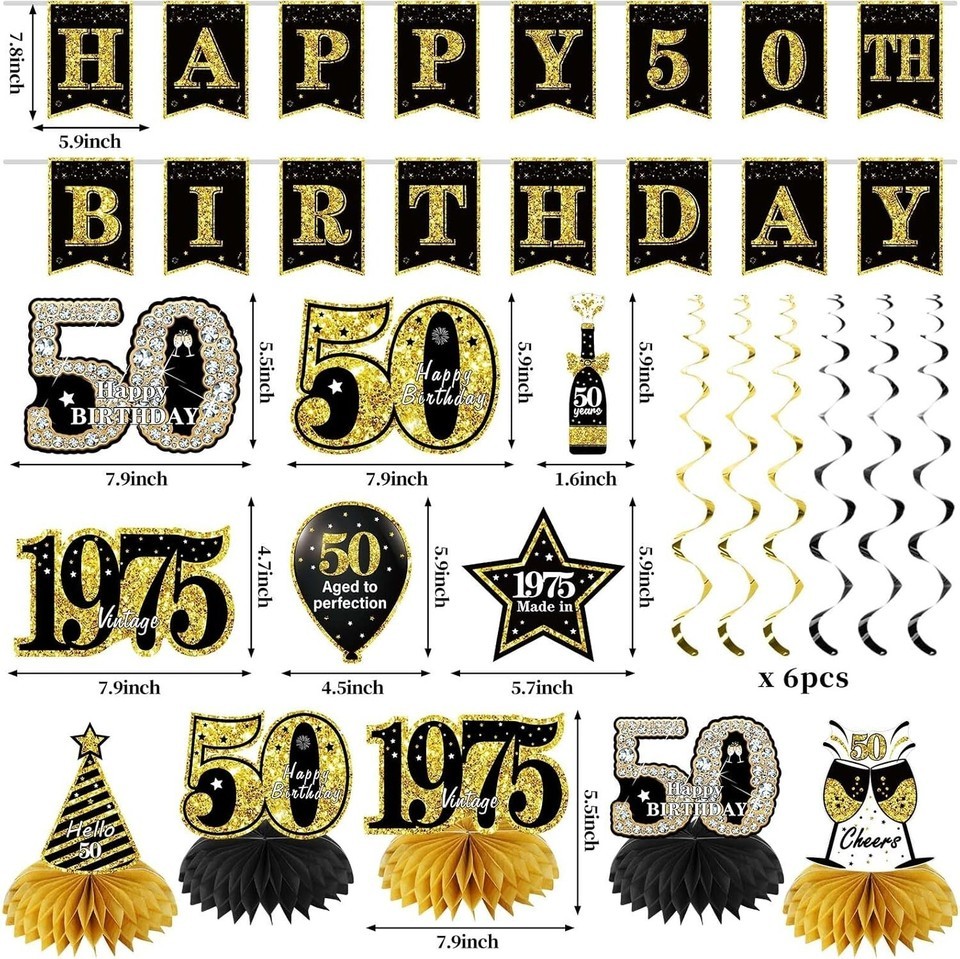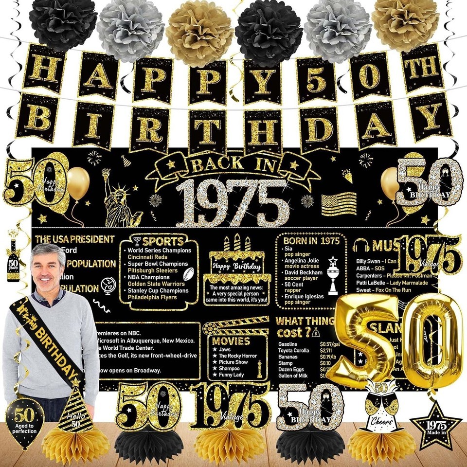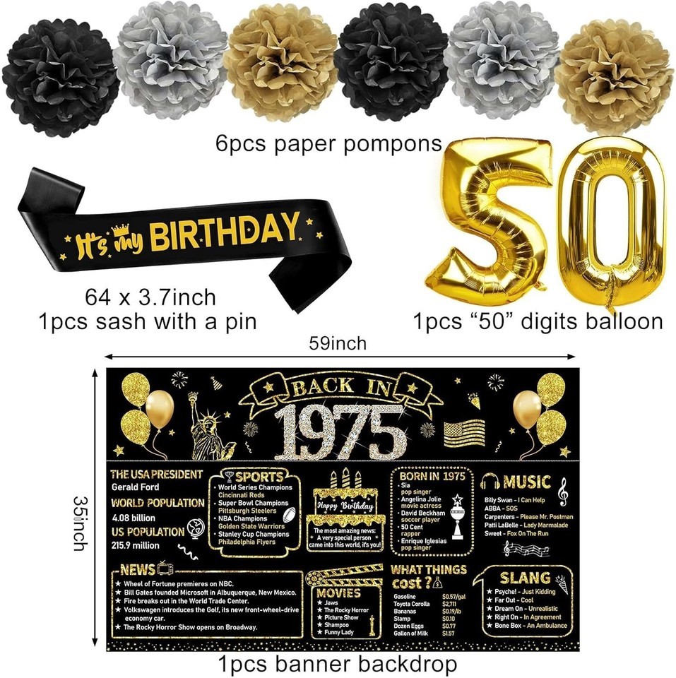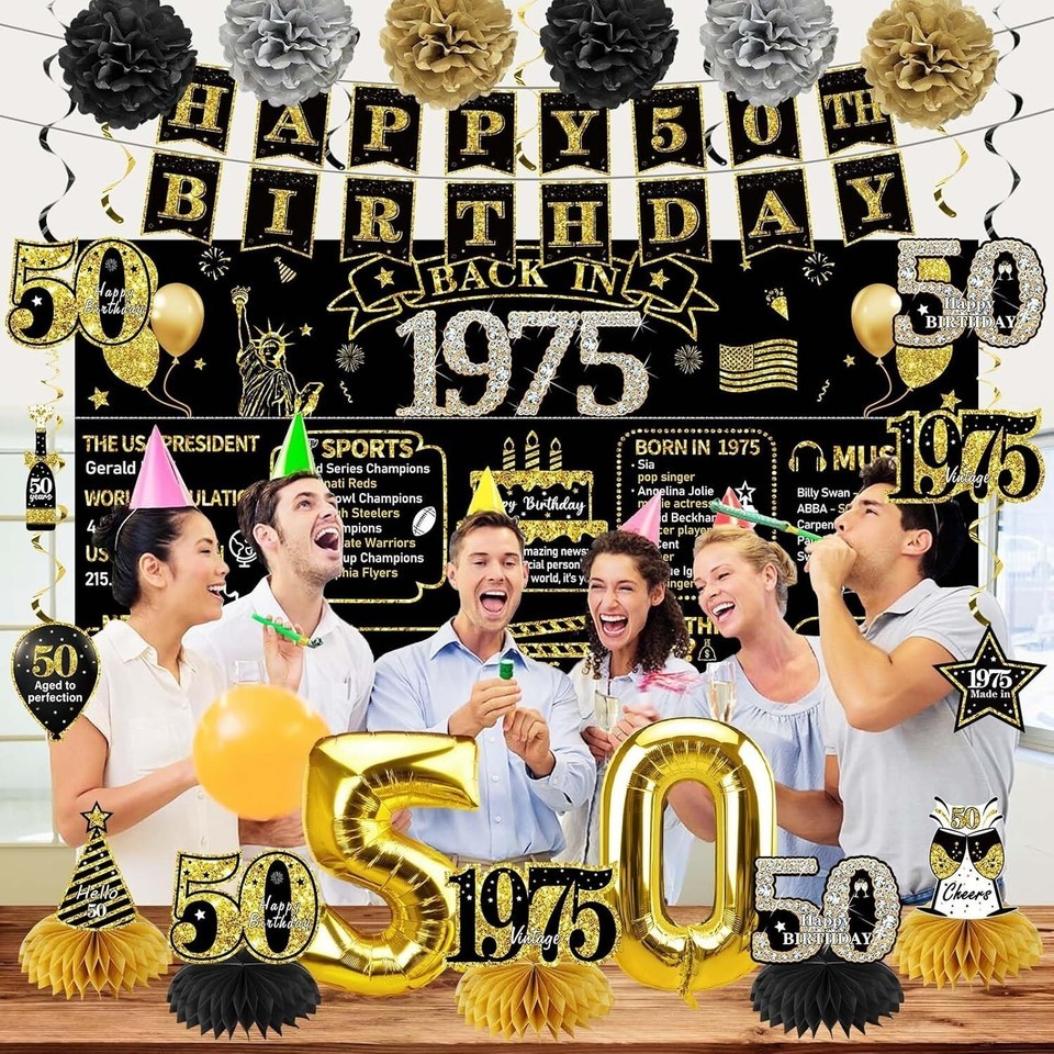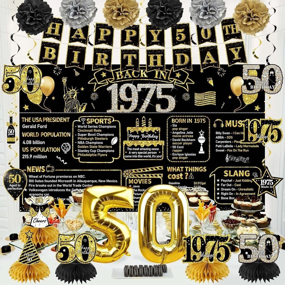 - Elegant 50th Birthday Decorations Set - 21pcs Retro 1975 Black Gold Theme