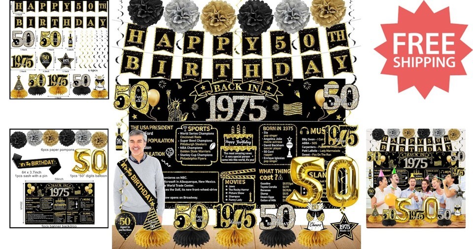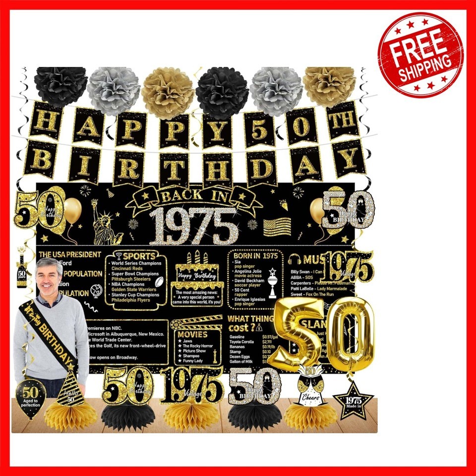 Celebrate a milestone with our comprehensive 21-piece 50th Birthday Decorations Kit. This themed set features a stylish 'BACK IN 1975' backdrop, a festive 'HAPPY 50th BIRTHDAY' banner, a prominent gold '50' balloon, honeycomb centerpieces, hanging swirls, pompons, and a sash with a pin ? perfect for indoor or outdoor celebrations. Crafted from durable materials like sturdy cardstock, aluminum foil, and polyester, these decorations are both eye-catching and practical. Easy to assemble, they make for fantastic photo props and decorations across walls and tables. Mark the special day with elegance and fun! To ensure fast and reliable delivery, we work with multiple fulfillment partners and suppliers. Depending on availability and location, your order may ship from different warehouses or arrive in packaging that varies from item to item. Tracking details are typically provided shortly after shipment, and customer satisfaction remains our top priority.