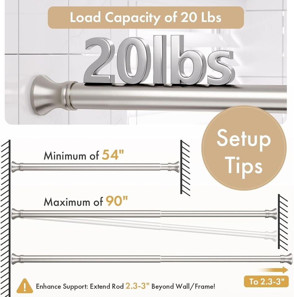 - Elegant 54-90 Inch Tension Shower Curtain Rod, Nickel Finish, No Drill Required