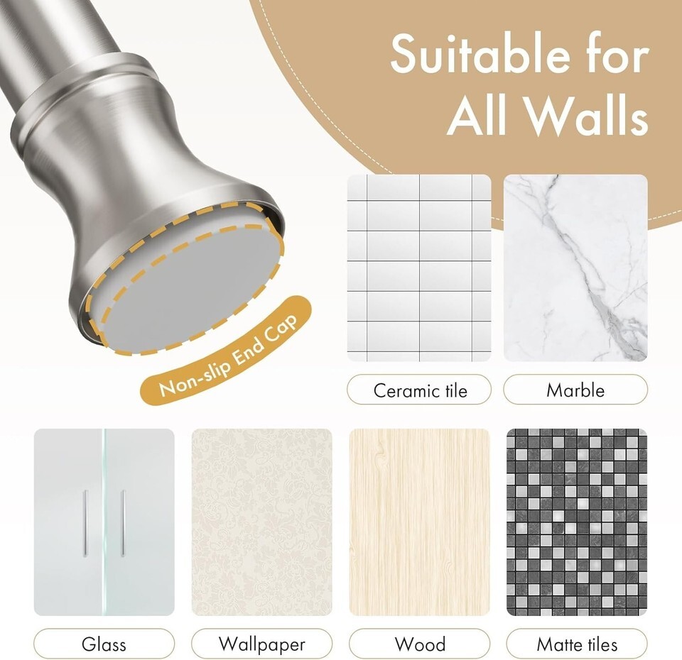 Versatile Application: Our tension rod is suitable for all types of surfaces, including smooth and rough textures like wallpaper, tile, and wood, adding a touch of elegance to any bathroom.
