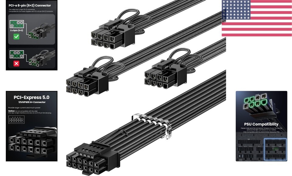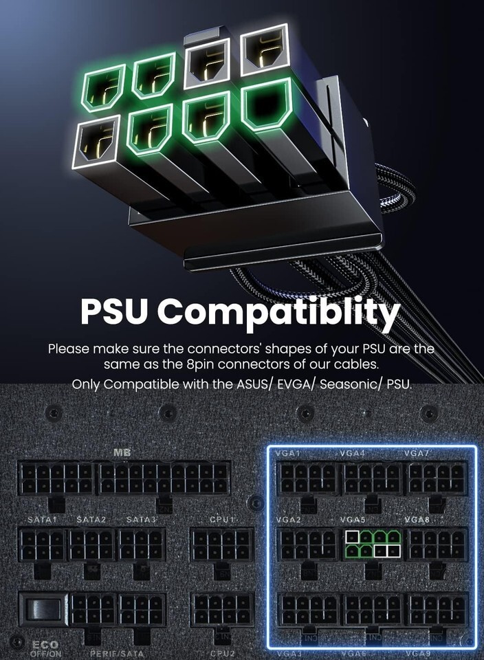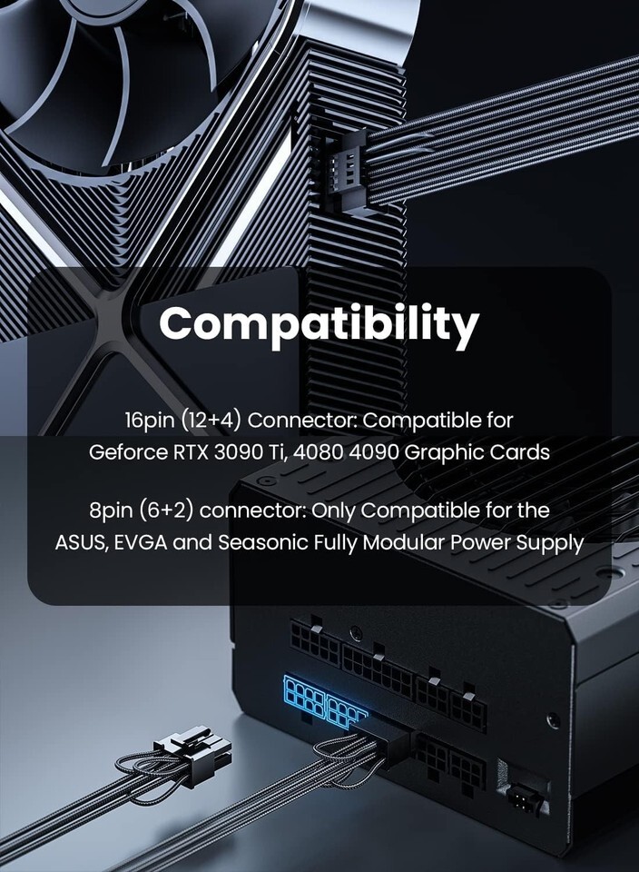 Not suitable for semi-modular or non-modular PSUs or for 12-pin GeForce RTX 3090, 8-pin RTX 4070 GPUs.