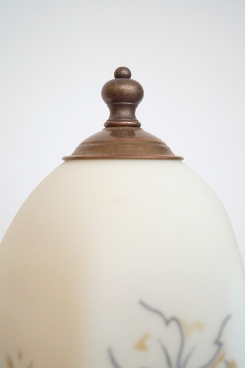 Original opal glass with a time-typical doting decor, beautiful lighting effect.