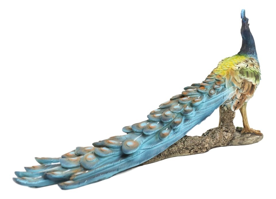 ? Elegantly perched, the Poised Peacock stands gracefully with its long iridescent train behind it. Boasting of striking colors of blue and indigo in different shades, as well as green, brown and many others, this peacock screams for attention! All your guests will be captivated by its colors and sheer expert artistry of the sculpting of the bird.